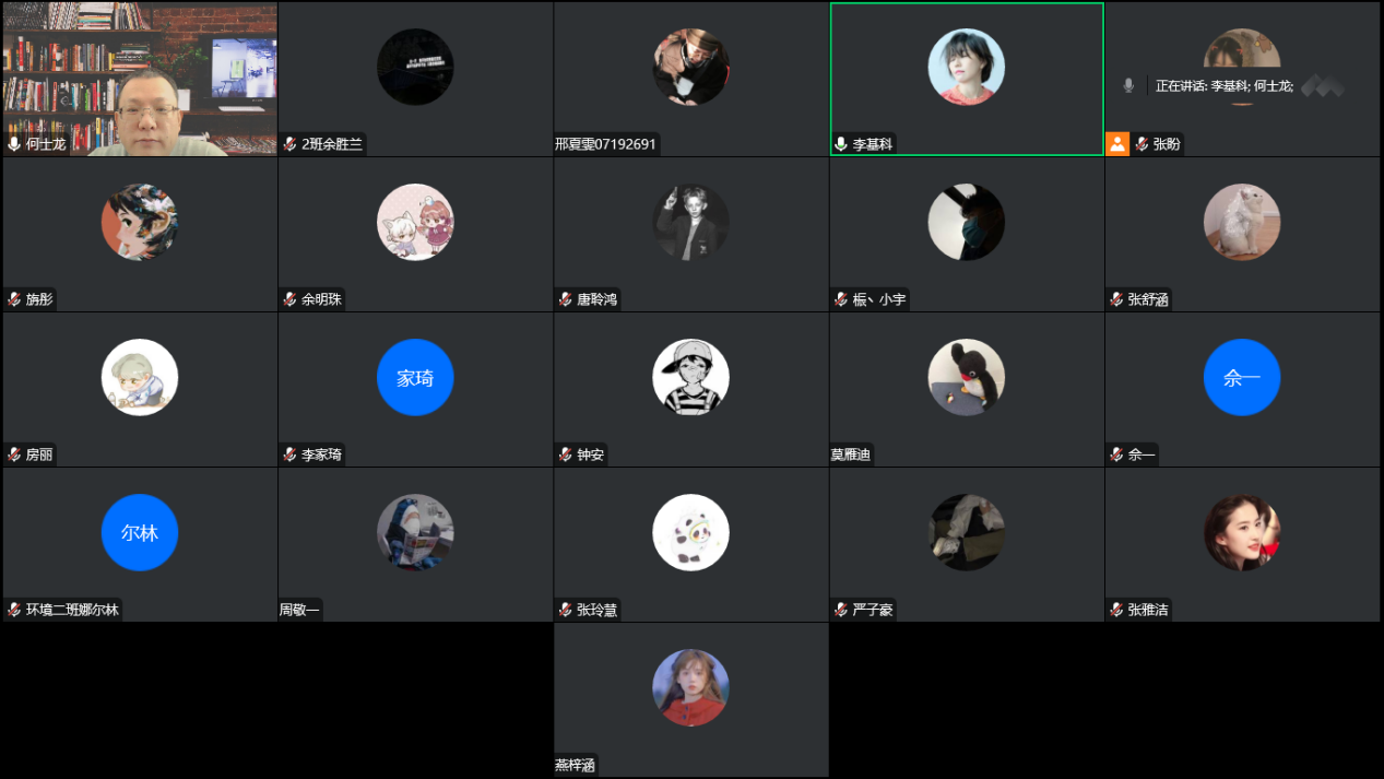 由于疫情,学校停止线下教学转为线上,我院全体同学按照学校要求,每日按时上线听课,课后积极完成作业;辅导员老师及时了解学生线上学习情况,做好专业老师和学生之间的桥梁,确保线上教学顺利开展。其中,我院董霁红教授、侯湖平教授、肖昕副教授、杨虹副教授、朱雪强副教授、刘银娥老师要求团队学生在积极配合学校防疫工作的同时,利用空余时间做好学习科研规划,充分利用时间提升自己;遥感22-2班主任王涵副教授、遥感22-3班主任闫世勇副教授、环境22-2班主任蒋家超副教授、环境22-3班主任袁丽梅副教授叮嘱本班同学疫情期间也要不忘学习,合理规划学习生活,保障学习质量;环科20-2班主任周来副教授在疫情期间通过线上视频班会的形式监督本班学生开展晚自习,激发学习热情和积极性。