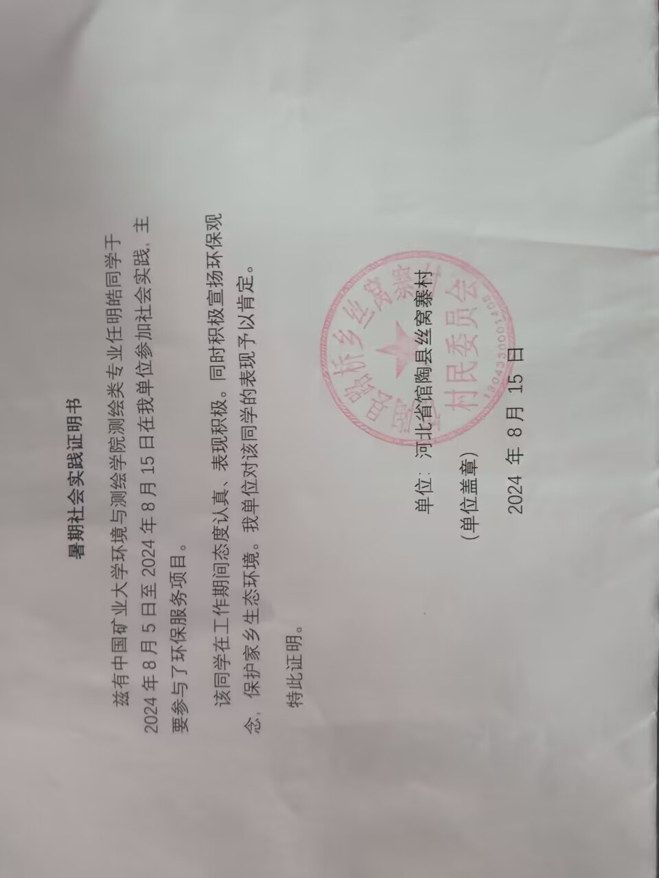 为进一步学习习总书记重要讲话精神,响应国家关于大学生参与社会实践的号召,回到了家乡参与环保服务项目。在2024年暑期,中国矿业大学我院的23级任明皓同学返家乡馆陶开展社会实践活动。目标是宣扬环保观念,保护家乡的生态环境,为乡村振兴注入新的活力。
