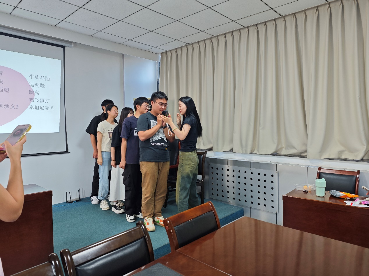 理论学习结束,成员们依次进行自我介绍。随后,在文体部部长葛梦瑶的主持下,成员们开始进行了“你划我猜”、“答非所问”等游戏,成员们积极参与,畅所欲言,现场欢声笑语不断。