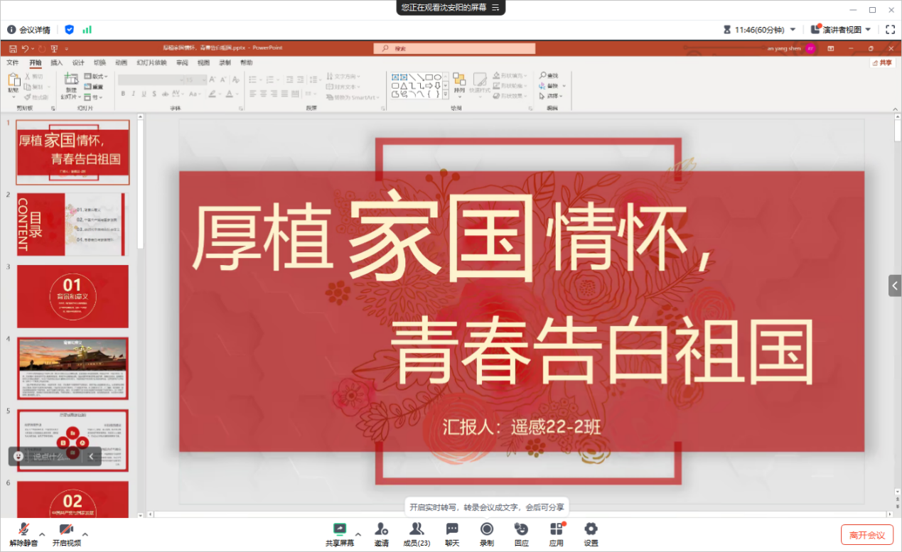 为了回溯中国共产党发展的辉煌历史,加强同学们对于党史的了解与认识,进一步理解中国特色社会主义思想。遥感科学与技术22-22024年10月24日在线上开展以"厚植国家情怀,青春告白中国"为主题的团日活动。