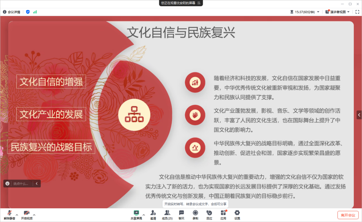 本次活动由组织委员沈安阳主持讲解。活动伊始,主持人强调了文化自信与民族复兴的必要性与重大意义,随后讲述了祖国75周年发展史的背景与意义。为了强调对祖国发展未来的展望和与之付出实践的重要性,并播放了两个视频,强化青年人的使命担当,还能激励同学们在今后的学习工作中牢记使命,突破创新,求真务实,创造无愧于时代的优良业绩,谱写壮丽的青春华章。
