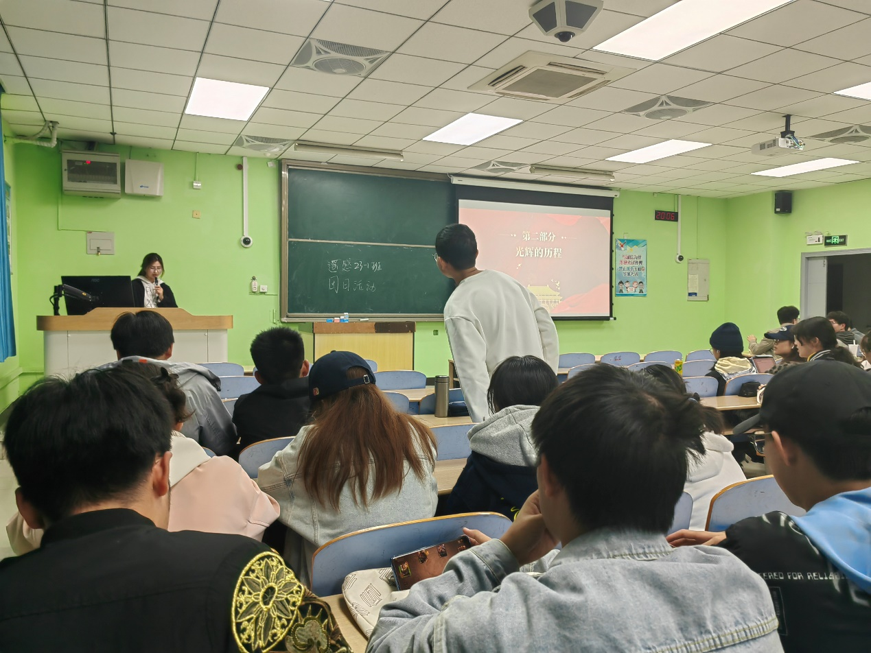 活动伊始,团支书杨苏为同学们列举了新中国成立以来的十大成就,不管是两弹一星,还是载人航天,同学们都深感认同。然后,团支书杨苏提出许多有关十大成就的问题,曹建鑫,梁凤珠等同学踊跃发言。之后,团支书杨苏用五个例子向同学们展示了新中国的光辉历程并从四个方面解释了伟大奇迹的内涵。接着杨苏同学从李大钊的照片引入新中国的历史启示。此外,同学们观看了不同的抗战视频,并猜出了它们的名字。最后,杨苏同学提出了一个列举红色歌曲和猜红色歌曲的活动。同学们积极参加,热闹非凡。