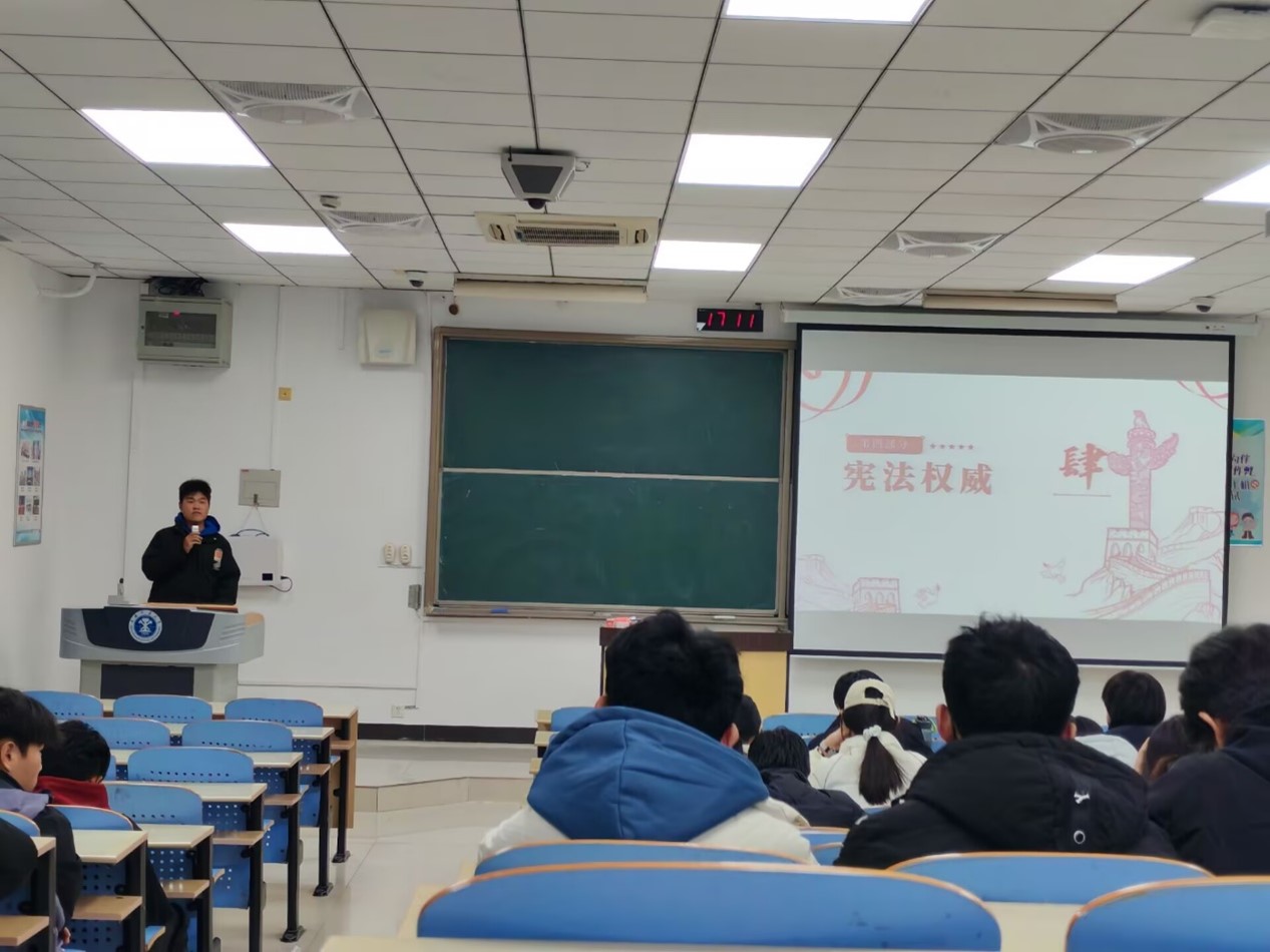 为增强大学生宪法意识,推动法治建设,使大学生深入理解国家制度依宪构建,认同制度优势,凝聚力量,提升民族向心力与国家认同感,促进国家稳定繁荣,2024年12月17日下午16:15,我院测绘类24级-6班团支部积极响应号召,组织本班同学于博学楼3号楼A303开展“弘扬宪法精神,坚定制度自信”主题团日活动。