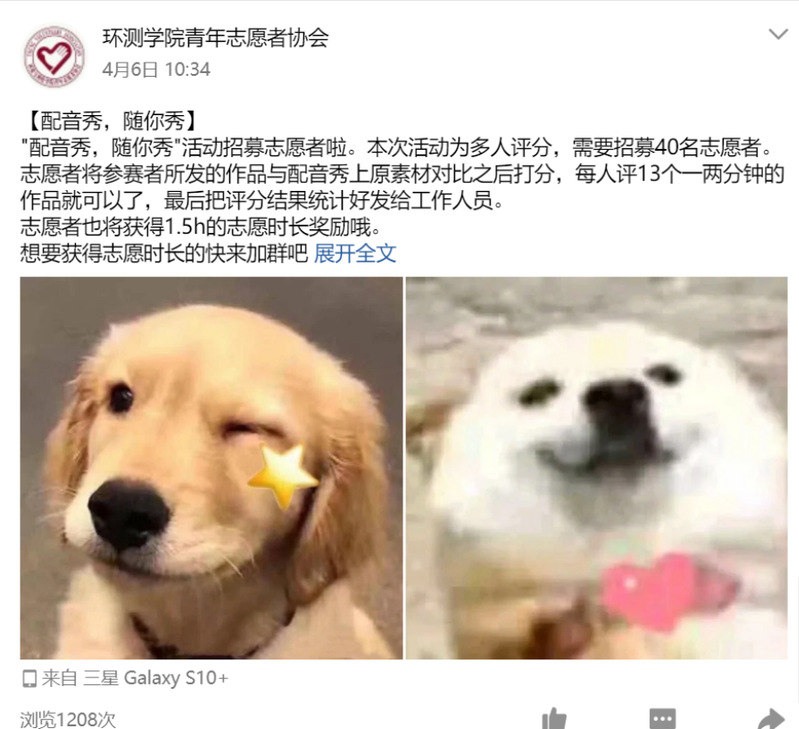4月6日至4月13日,我院青年志愿者协会举办了“配音秀,随你秀”活动。活动主要内容为参赛者在线上提交外语配音作品,经过评分后根据作品最后的得分情况获得相应的志愿时长。同学们在配音秀上以外语的方式配音,既可以丰富学生的课余生活,也可以使大家通过学习配音学到一定的外语口语技巧。