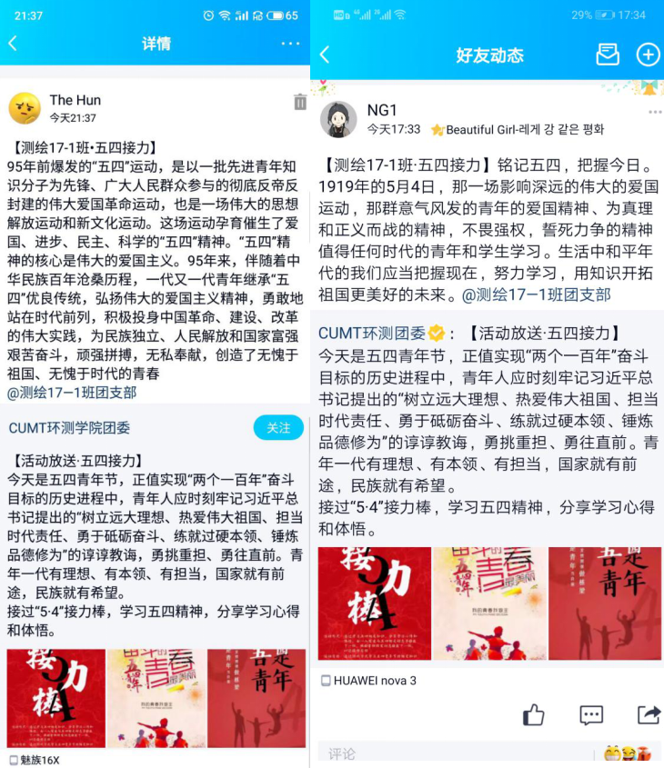 又值一年一度的五四青年节,我院测绘17-1班团支部组织了线上讲座学习和自我感悟活动。团支部成员认真研习了下发的学习材料,并以接力的方式在空间发表自己的学习心得,力争做到深刻体会并学习到五四精神,从而以更加高涨的热情、饱满的奋斗精神,为建设祖国的美好未来而不断奋进。