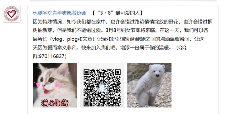3月8号起,我院青年志愿者协会环保部在全院发起“3·8最可爱的人”志愿活动,吸引同学们关注和参与到本次活动当中。本次活动旨在在妇女节的节日氛围下,让大家多感受到自己和母亲或者姥姥奶奶之间的亲情并且记录下这一美好回忆。