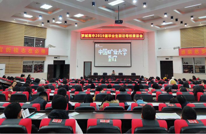 晚7点,宣讲会于学校大会议室正式开始。宣讲围绕大学生活与高中学习经验两个方面进行。首先,为营造轻松氛围以缓解高三学子的学习压力,宣讲人覃晓月为同学们播放了一段关于中国矿业大学校园美景与学习生活的宣传视频,吸引了同学们的兴趣。随后,宣讲人结合PPT向同学们简要地介绍了学校的办学规模、师资力量和发展前景等方面的信息,让同学们对矿大有了初步的认识,并为同学们分析了矿大所具备的优势及其高性价比。宣讲人通过分发的宣传报,着重为同学们分析了矿大在广西近几年的“录取分数线”,积极回答了同学们提出的问题。