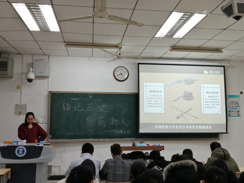 下午4点,活动开始。团支书主持召开,通过PPT的形式分别从“一二·九运动”的含义、背景、经过、结果及历史意义四个方面让同学们充分地了解了历史上这次伟大的爱国游行。同学们通过讲解认识了姚依林、彭涛、孙敬文等为国家奉献自己青春的爱国人士,更深切体会到祖国万千同胞的爱国情怀。最终,同学们观看了与“一二·九运动”有关的视频,看到在枪林弹雨里觉醒的国人与崛起的中国,切实感受到了“一二·九运动”的精神内涵,活动结束。