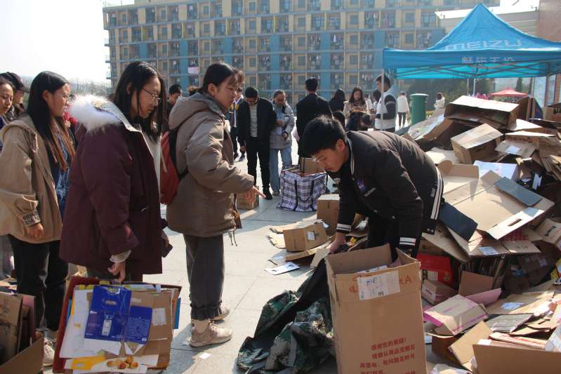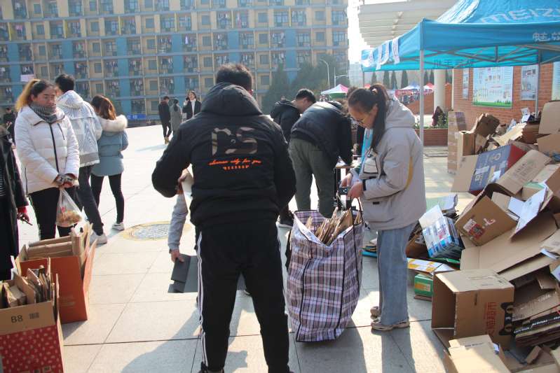 工作人员帮助同学们有序回收纸箱