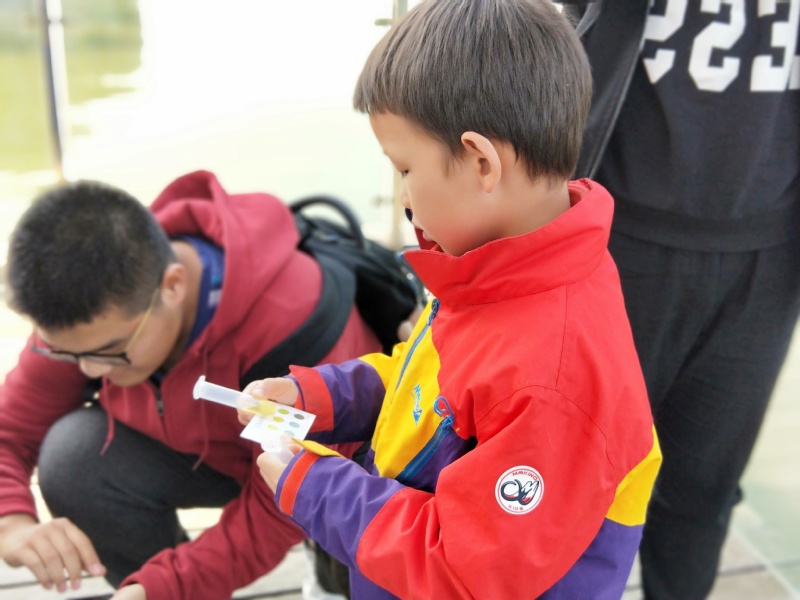 上午9点,大学生世纪环保组织水资源项目部成员抵达云龙湖,活动负责人开始有条不紊地指导部员分组行动。在保证取水间距适中的前提下用塑料瓶进行随机取样,利用试剂比色卡等工具对样本的基本情况进行了检测,检测指标包括钙离子的含量、镁离子的含量等。记录员在旁一一记录。同时,信息组成员在起点及沿途拍照、录像,及时在新媒体平台上发布相关动态。值得一提的是,水质检测活动吸引了路人们的驻足围观,附近孩童一同参与到检测中,这从侧面反映了大众对于水资源现状的关心。
