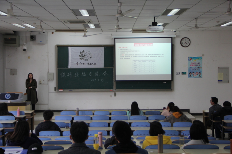 下午2点,交流会正式开始。首先由青行环协会长齐振国向与会同学介绍两位学姐保送情况。随后,第一位分享经验的是保送至浙江大学攻读环境催化方向的曹可锌,她从保研流程、经历经验两个方面向同学们进行了详细介绍,着重就自身参与高校夏令营和科研项目经历提出了指导性建议。第二位分享经验的是保送至中国人民大学的旷文君,她主要分享了自己大学学习生活经历,包括学生工作中的出色表现以及专注学业的难忘经历。交流会最后的提问互动环节,提问者就雅思托福备考、国外访学等相关问题向学姐讨教,她们也都一一进行细致的解答。