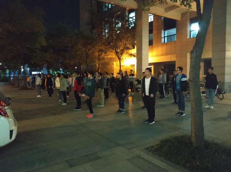 10月15日晚,我院广播体操队全体成员在图书馆一旁空地上进行训练,此次训练旨在为即将到来的中国矿业大学体育大会做准备。
