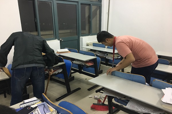 晚7:00,生活部志愿者的同学在通宵自习室门口集合并分配任务。由于此时有其他同学在上自习,志愿者事先向他们介绍了此次活动的内容,并对打扰到同学自习表示歉意。上自习的同学表示能够体谅志愿者们。随后,志愿者们有条不紊地打扫着,擦桌子、扫地、拖地、分工明确,有序进行。经过志愿者们一番认真细致的清理,通宵自习室变得更加整洁卫生,为同学们提供一个清净舒适的学习环境。最后,志愿者同学在自习室张贴了自己制作的宣传标语,提醒同学们保持室内清洁。