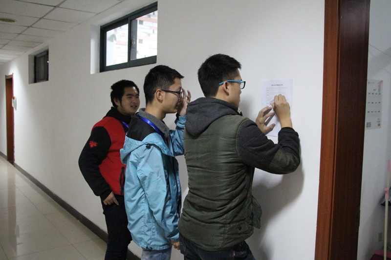 到达参与评比的宿舍后,各干事先就宿舍总体装扮进行检查拍照,然后再对于寝室的清洁内务进行细致考察,除此之外各干事还对宿舍设备进行检查,考察宿舍是否有违禁物品。最后宿舍考察完毕,检查人员进行讨论,综合各人意见对宿舍装扮进打分。