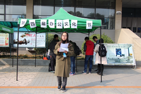 11月14日中午12时,我院学生会办公室在一食堂广场积极开展第四届办公文化节的宣传活动。该活动由共青团中国矿业大学委员会主办,由我院、化工学院等协办,旨在帮助同学们强化办公技能,丰富同学们课余生活。