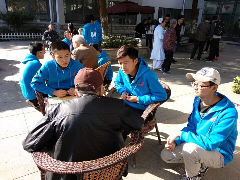 在向敬老院的工作人员了解到敬老院的有关情况后,团支书将全班同学分为六个小组在各小组负责人的组织下志愿者们有序进入老人们的房间主动的开展志愿者服务。有陪着老人们聊天的、有搀扶着老人在院里散步的、有几名志愿者还即兴唱起了红色革命歌曲、吟起诗歌,为老人读报、剪指甲、整理头发、捶背按摩,每组成员为老人表演节目,与老人开展简易欢愉的互动游戏。从和老人们面对面的交流中,志愿者们了解到老人们现在的生活状态、以及不便和希望,此外老人们通过给志愿者讲述年轻的时候以及与家人、孩子的故事,仿佛过去的回忆又浮现在他们的脑海中,老人们还给志愿者们看他们儿女的照片,分享他们与儿女的点点滴滴,并感慨现今生活的美好,并嘱咐志愿者们要学会珍惜。