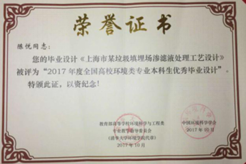 “全国高校环境类专业本科生优秀毕业设计(论文)奖”是由教育部高等学校环境科学与工程类专业教学指导委员会、中国环境科学学会主办,本次评选共有浙江大学、哈尔滨工业大学、中国矿业大学、北京航空航天大学等高校121篇作品参评,经专家组初审、复审和终评,最终评出36篇“2017年度全国高校环境类专业本科生优秀毕业设计(论文)”作品,其中优秀毕业设计12篇,优秀毕业论文24篇。此次评选其主要面向全国环境科学与工程类专业的本科毕业生征集作品,包括环境科学与工程、环境工程、环境科学、环境生态工程、环保设备工程、资源环境科学、水质科学与技术等专业。目的是为不断提高环境科学与工程类专业本科生培养质量,提高学生理论与实际相结合和解决复杂环境问题的能力,为我国环境保护事业输送更多高质量人才。