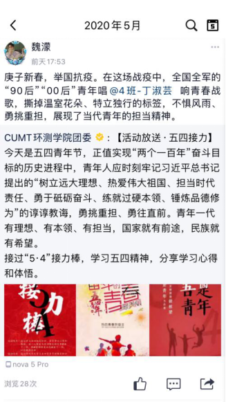 在我院团委的组织下,我院环境19-4班于5月4日开展了以线上交流为主题的五四青年节团日活动。本次活动旨在引导广大团员青年深入学习实践科学发展观,进一步弘扬爱团、爱党、爱国精神。