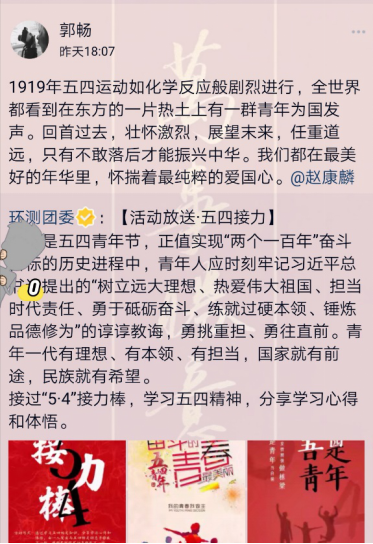 为了弘扬爱国、进步、民主、科学的五四精神,积极推进青年文化建设,激发同学们的爱国创新热情,我院环境18-3班的同学于5月4日在线上举办了“五四接力”活动。