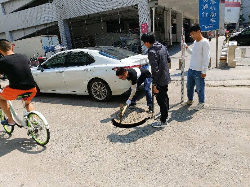 本次测量小区地貌复杂,部分地区需要通过升降GPS来调节信号,因此为了减少实践的复杂性,郑亚峰通过间隔一个下水道井盖打开一个下水道井盖来确定管线方向,并且对一些有显著特征的井口,如交叉口,汇聚口等进行严格测量。测量之前,工作人员曾细心讲述了一些类似“洋镐比较尖锐,使用时要注意安全,下水道打开后要记得关上”的测量安全注意事项。