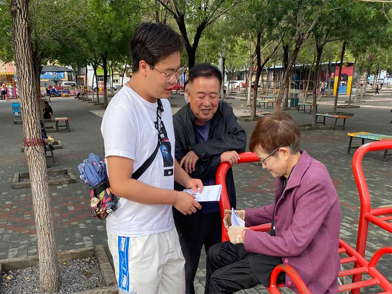 线下宣传组成员则做好防护,并选择在人口密度较小的公园、社区进行宣传活动,发放团队亲手制作的宣传册等宣传材料。李俊池同学在宁夏银川市展开宣传调研工作,赴公园对老人、儿童等行人讲述了野生动物的种类以及擅自食用的危害等知识,并发出了保护野生动物的倡议;欧阳文峰同学则在甘肃兰州市进行实践,前往附近社区对居民进行了野生动物种类、生活习俗等知识的普及。几位同学的宣传工作均得到了各市民的一致认可。