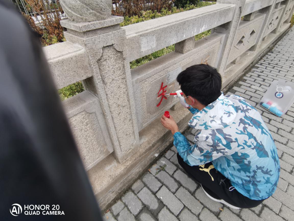 为响应苏州市人民政府建设文明城市的号召,2020年8月28日至30日,我院学子景建鹏加入苏州市吴中区城管志愿者服务队,对苏州市区内石桥的字体进行描红和修缮工作。8月29日下午,景建鹏来到吴中区城市管理局,领取到描红所用的油漆以及刷笔,随后对58路公交车沿线的十几座石桥字迹进行了描红。景建鹏与其他志愿者认真工作,实践活动受到了周围群众的围观与赞赏,起到了良好的社会带头作用。