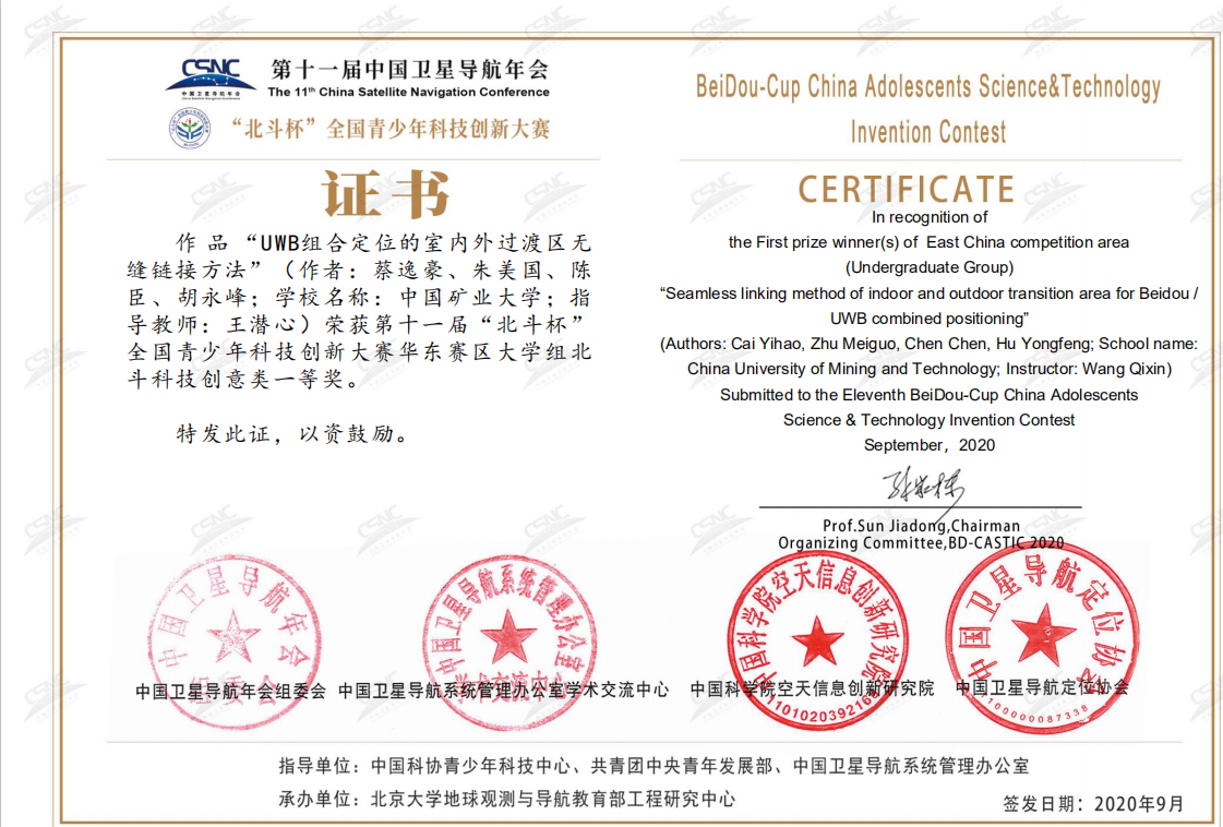 8月30日,第十一届“北斗杯”全国青少年科技创新大赛全国总决赛评审工作在北京顺利结束。由我院王潜心老师指导,蔡逸豪、朱美国、陈臣、胡永峰同学完成的参赛作品《北斗/UWB组合定位的室内外过渡区无缝链接方法》获得“北斗杯”全国青少年科技创新大赛全国总决赛三等奖。