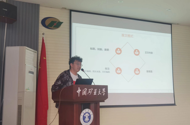 会议伊始,由新闻宣传部副部长王泽昊首先上台讲解如何制作微信推文。王泽昊从推文平台,推文格式,推文内容这三个方面详细介绍了微信推文制作过程,并通过实际操作简单演示了推文制作过程。