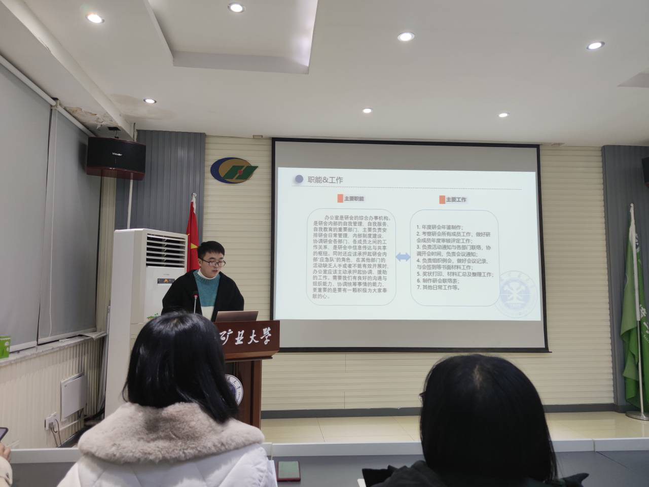 接着是学术部部长李铭婉讲述学术部的情况,学术部举办了多次学术讲座,如国奖交流大会与公考经验分享会,并负责三次学术报告的考核工作,最后指出学术部接下来的工作重点是开展“声临其境”之英语配音征集活动与2020地球空间信息科学博士生论坛、36365路检测中心第四届研究生学术论坛。宣传部部长王铜对于宣传部工作总结表示,宣传部是一个负责活动前后宣传的部门,并向各个部门说明了成员的分工以及宣传部需要做的具体工作。