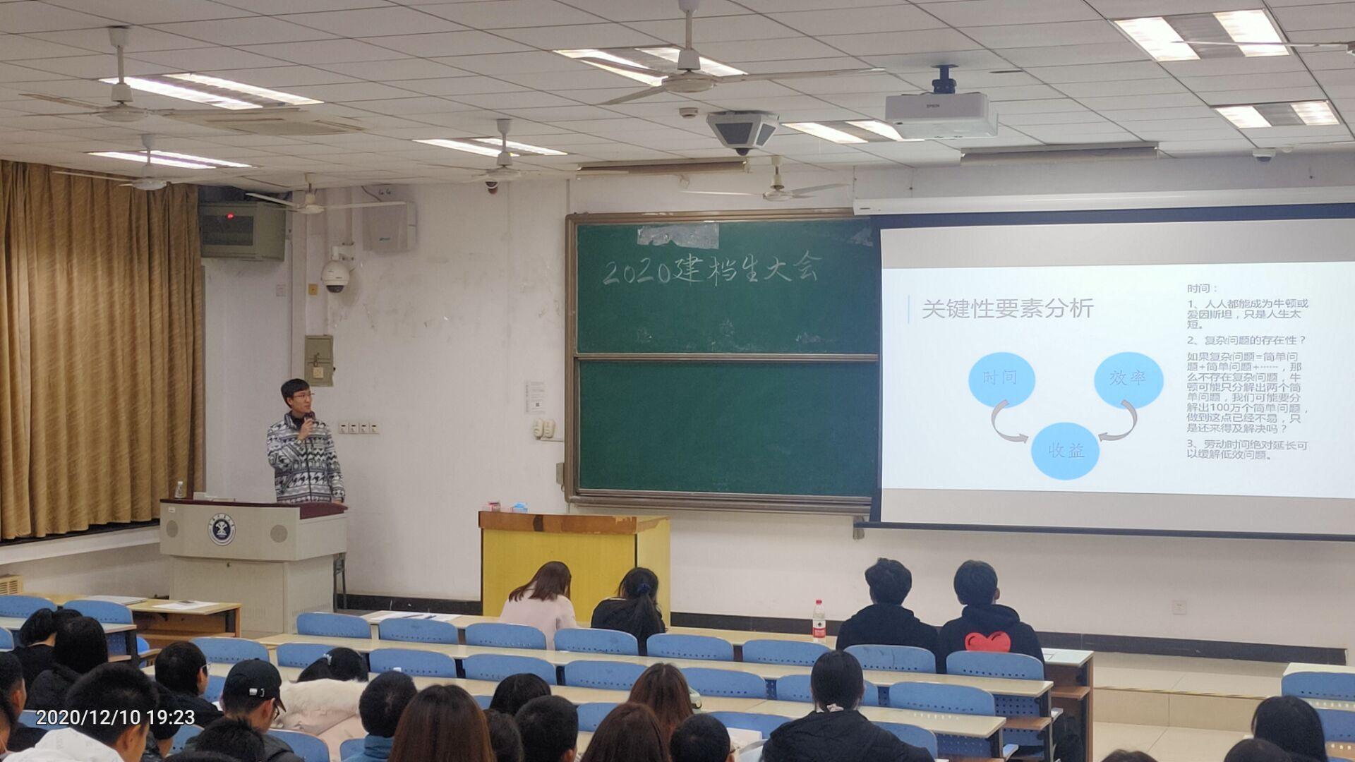 会上,首先由青年励志队主席介绍了励志队的建立与组成,并向在座的建档生介绍了关于建档生的平日义务活动及奖惩制度,同时也提出了对建档生积极参加部门安排的各项志愿服务的希望。随后,由20级兼职辅导员张家鹏简明扼要地介绍了励志奖学金的评选和要求。最后,由19级、17级的两位与会嘉宾分别向20级的新生们分享了自己的学习和志愿服务的经验,鼓励同学们心怀感恩积极向上奋发图强,并且帮助大一新生建立目标,更好的进行日常学习和志愿工作。