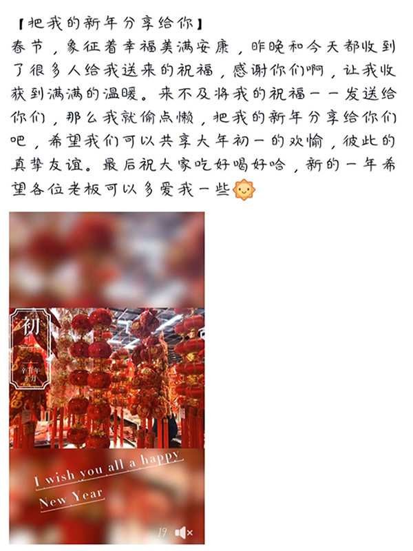 本次活动分为两个部分。第一部分为“打卡新年崭新姿态”,参赛者需要在新年当天亲自做一件自己原来从未做过的关于新年的事。同学们纷纷表示,这一活动让他们第一次写对联、第一次独自置办年货、帮助家人一起做一顿年夜饭,让他们充分感受到传统节日的文化魅力。并且,参赛者将活动过程以照片的形式记录下来,并附上了“第一次”感悟发送在QQ或朋友圈上。第二部分为“把我的新年分享给你”,参赛者需要在新年当天拍摄有纪念意义的场景,按照时间线剪辑成一个视频,并附上一段感悟文字,分享新年当天的喜悦心情。最后,在同学们的积极配合下,活动顺利结束。