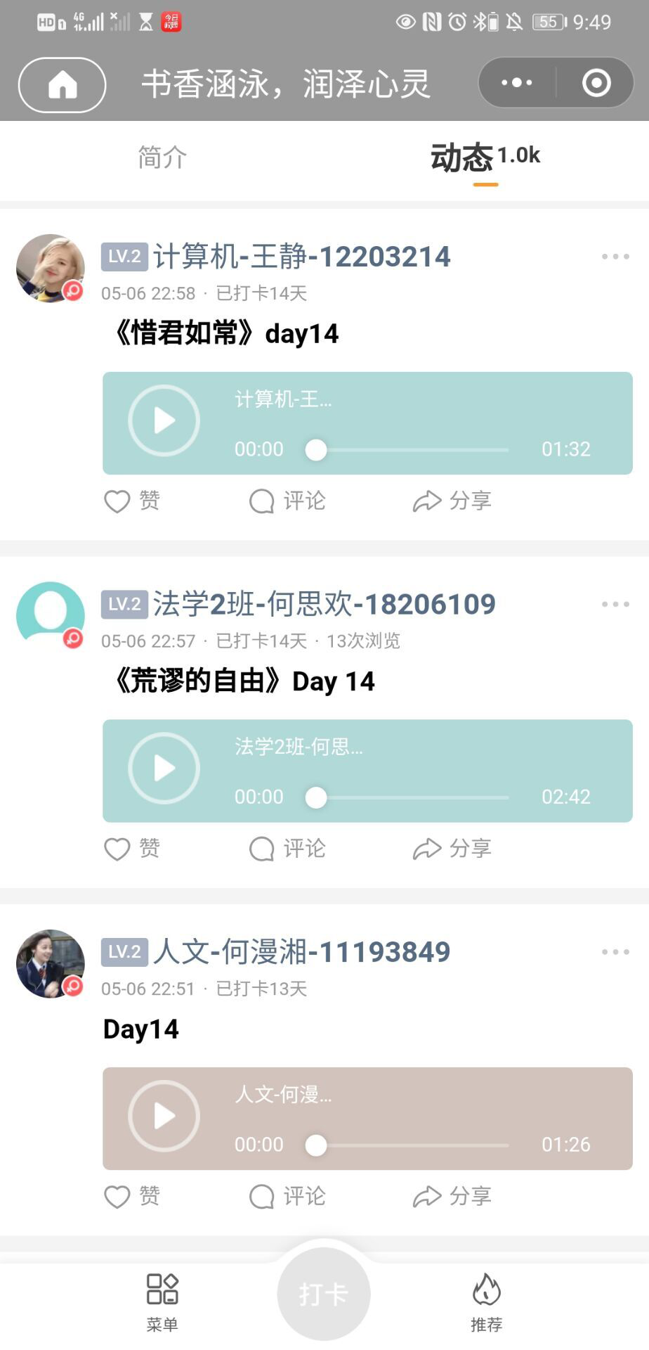 为庆祝“世界读书日”,提高大学生对读书的重视,同时更好地响应国家“坚持以人为本,保障和实现人民群众的文化权益”的号召,在全社会倡导多读书、读好书的文明风尚,营造全民读书、终身学习的良好社会氛围,我院与公共管理学院、计算机科学与技术学院于4月20日至5月6日联合举办了“书香涵泳,润泽心灵” ——世界读书日线上录音读书打卡活动。此次活动由共青团公共管理学院委员会、共青团36365路检测中心委员会、共青团计算机科学与技术学院委员会主办,由公共管理学院学生会办公室、36365路检测中心办公室、计算机科学与技术学院学生会文宣部承办。