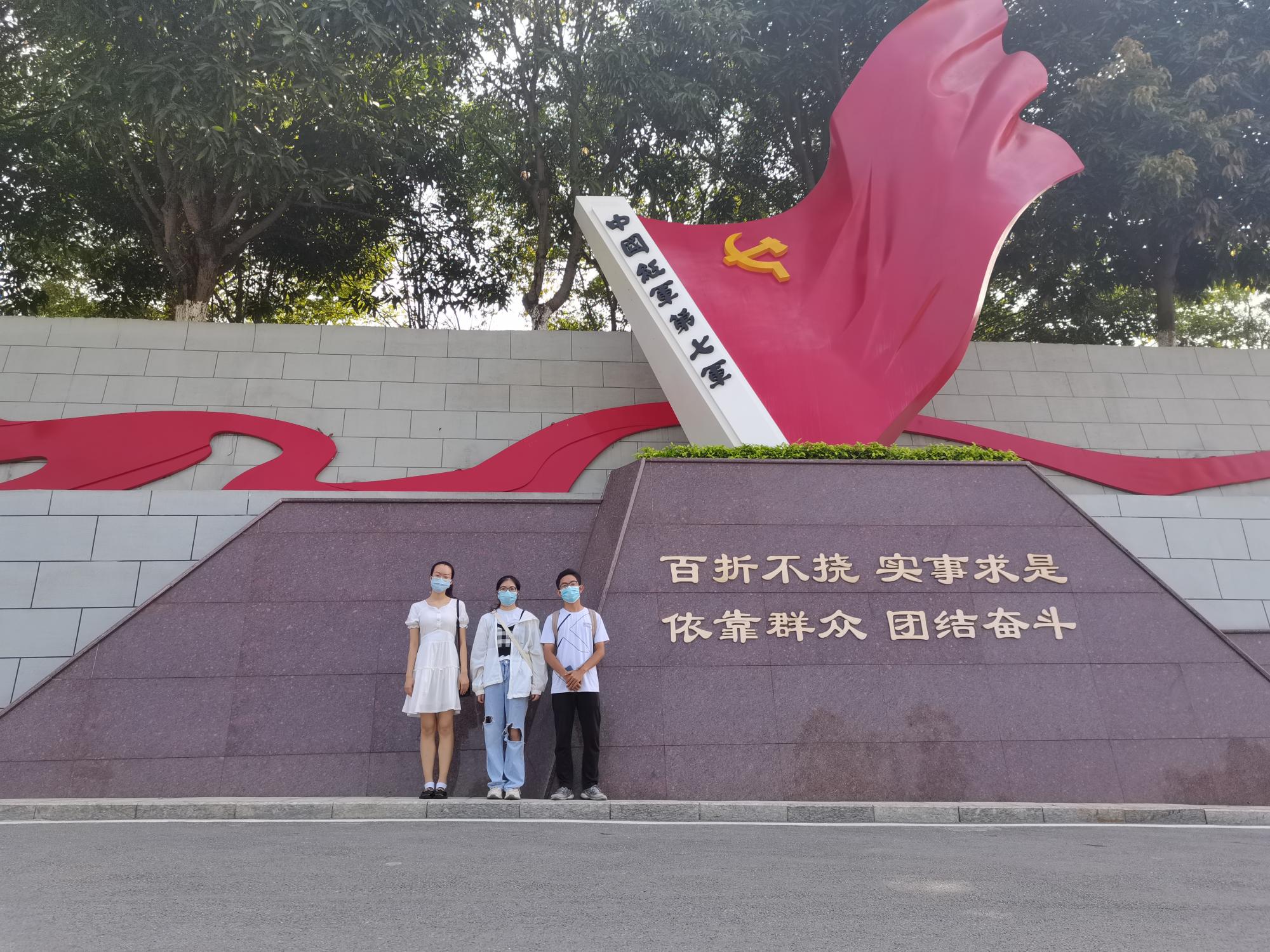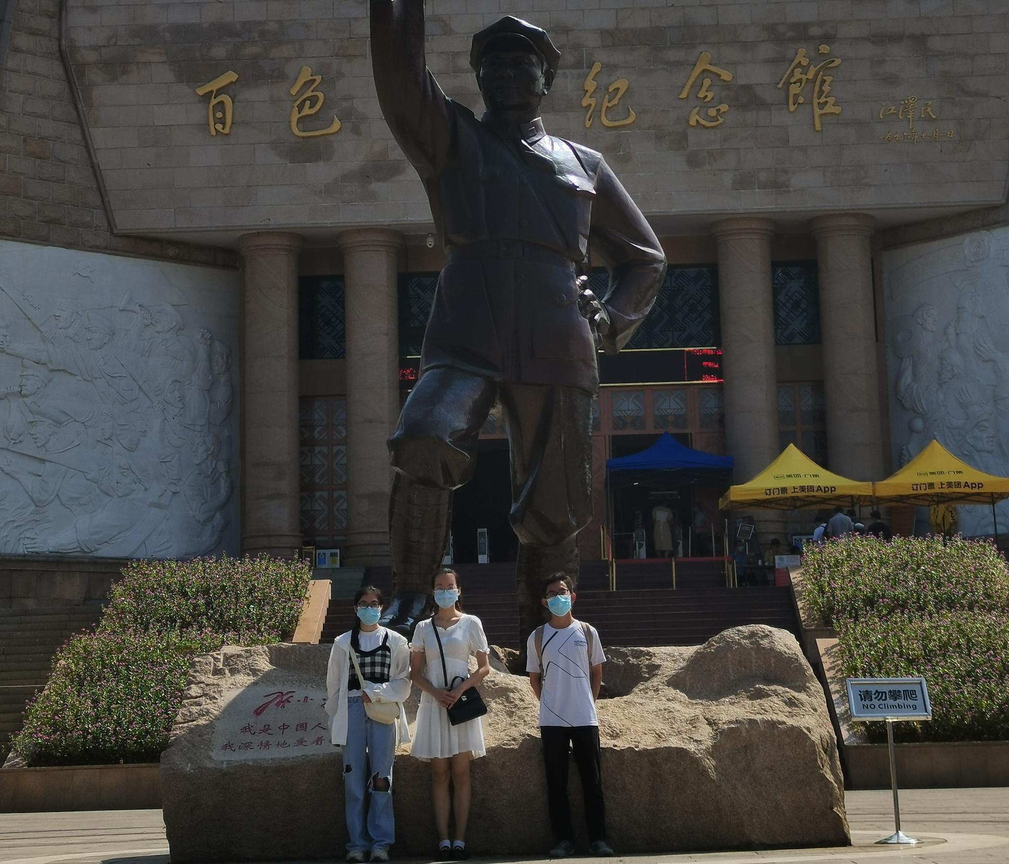 实践团乘车前往迎龙山,刚下车一面红墙便映入眼帘,上面刻有“百折不挠,实事求是;依靠群众,团结奋斗”十六个大字和一面飘扬着的党旗,让我们感受到了浓浓的红色革命气息。再往山上走便到了百色起义纪念馆门前了,门前立有一个巨大的邓小平青铜雕像。