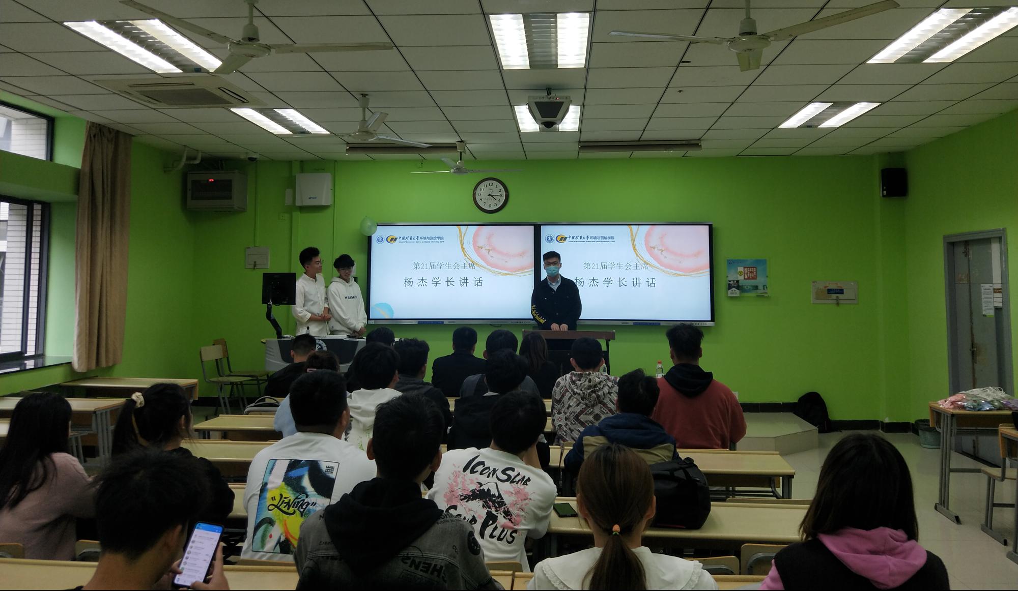 随后,第二十一届学生会主席杨杰同学上台发言,他回顾了去年一年工作并为新一学年学生会的工作提出建议。随后,各部门部长向大家介绍了新成员,同时对以往工作进行了总结并展示了部门的工作计划。介绍完毕后,朱守庆同学上台做了总结,对未来一年中学生会的工作提出建议。