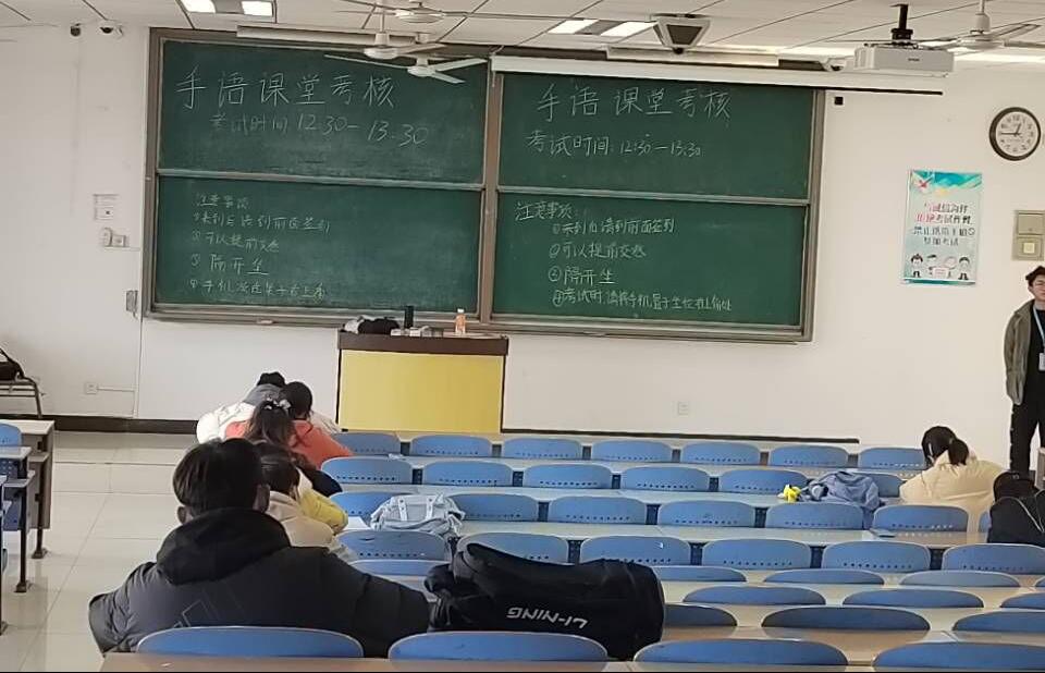 11月10日至12月18日,我院青协助教部开设了手语课堂,对参加的同学进行手语培训,培训内容主要为简单日常对话手语练习。考核内容分为笔试和视频两个部分,考试前,参加手语课堂的学员们按时到达考场,积极参加本次结课考试。下午13:30,笔试考核顺利结束,学员们交卷后有序离场,试卷将由手语栏目负责人进行批改,并根据成绩对学员进行奖励。随后,学员们自行录制手语教学视频,并于12月23日19:00前上交。最后,主办方根据笔试和视频成绩进行最终成绩统计,并公示获奖人员名单。