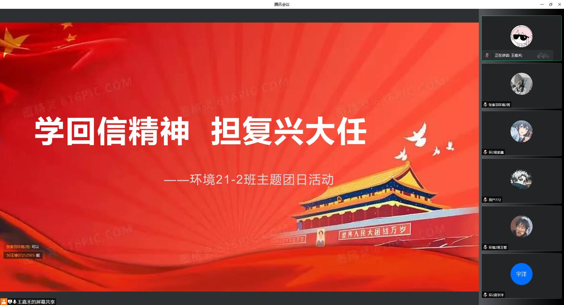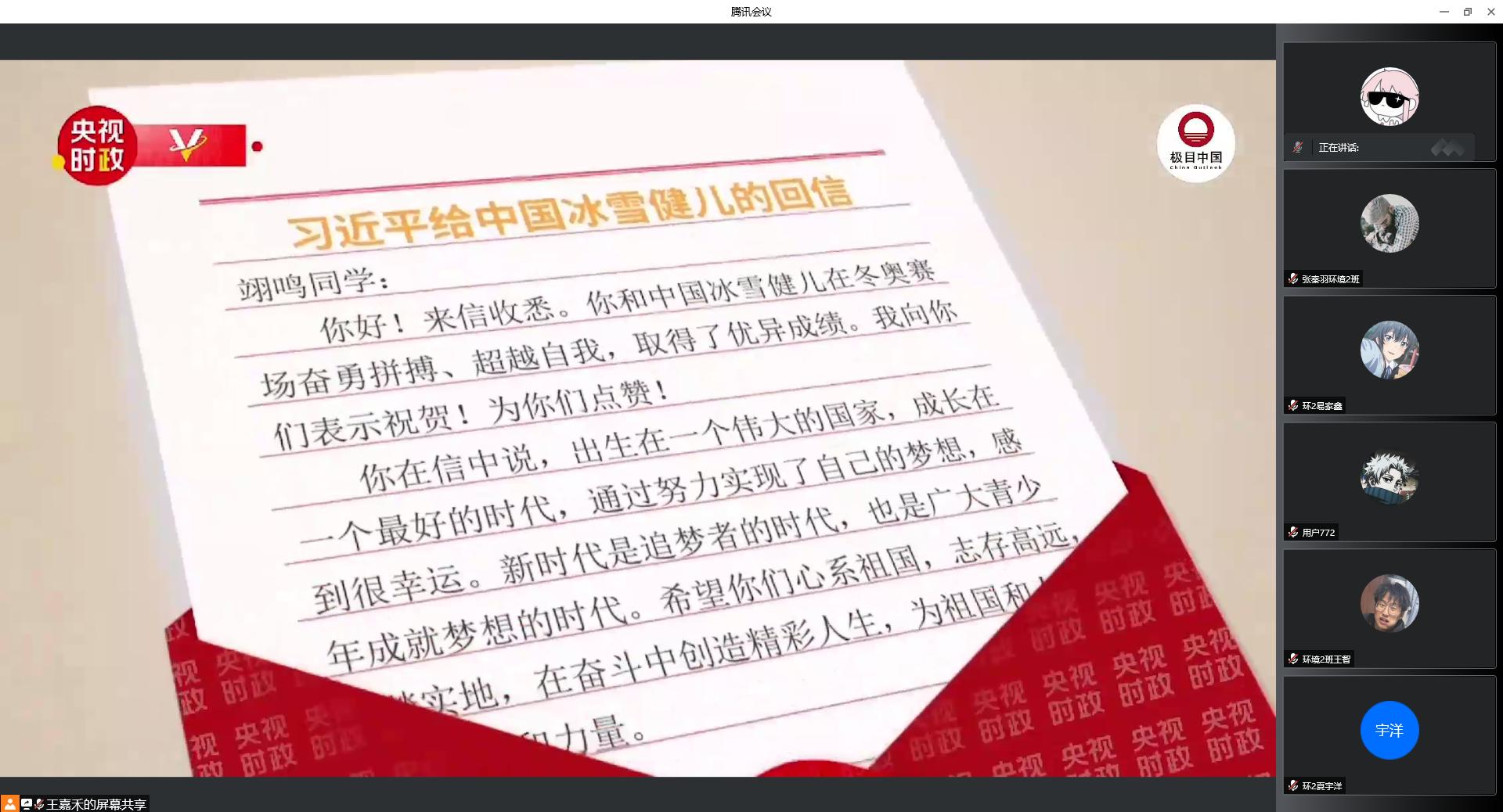 为促进同学们深入领会习近平总书记对冰雪健儿重要回信的丰富内涵,积极响应习近平总书记回信中指出的伟大精神,4月26日,我院环境21-2班在线上开展了主题为“学习贯彻习近平总书记给中国冰雪健儿重要回信精神”的团日活动。