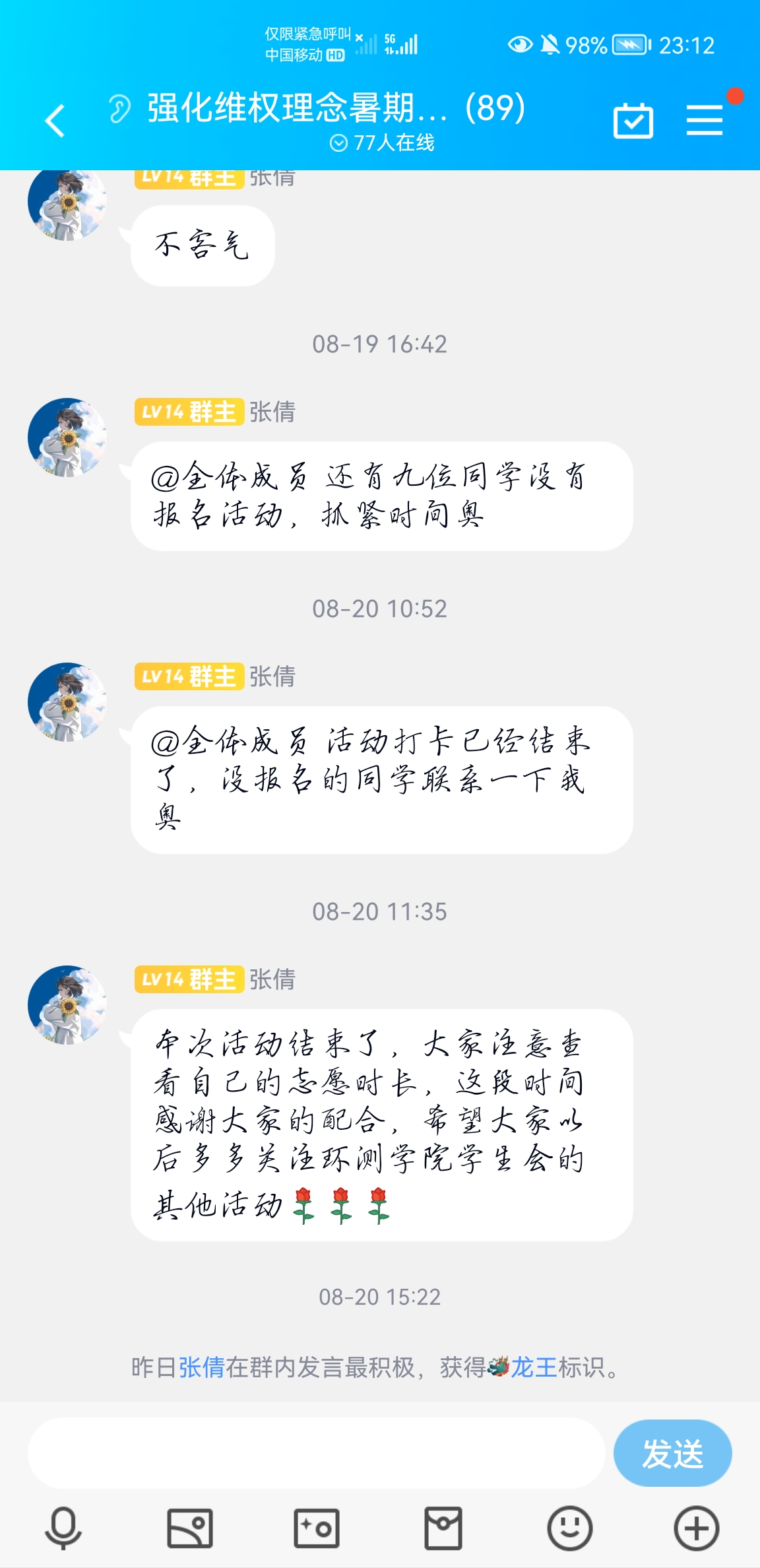 活动过程中,生活权益部成员每天在活动群分享一个维权小知识,参加活动的同学需要在每晚八点前将维权小知识分享到自己的QQ空间,然后将说说截图发至群内,工作人员负责记录,截图后才算一次参与成功。其中内容包括法律知识、消费维权知识、消费者权益、不正当行为的辨别和处理办法等。参与者将小知识分享到空间的同时,也会使更多的人了解到,从而起到强化维权意识、传播权益知识的效果,也达到了本次活动的初衷。活动共14天,最后由学院青协晨勉部的同学负责统计并进行志愿时长的打卡,至此活动结束。