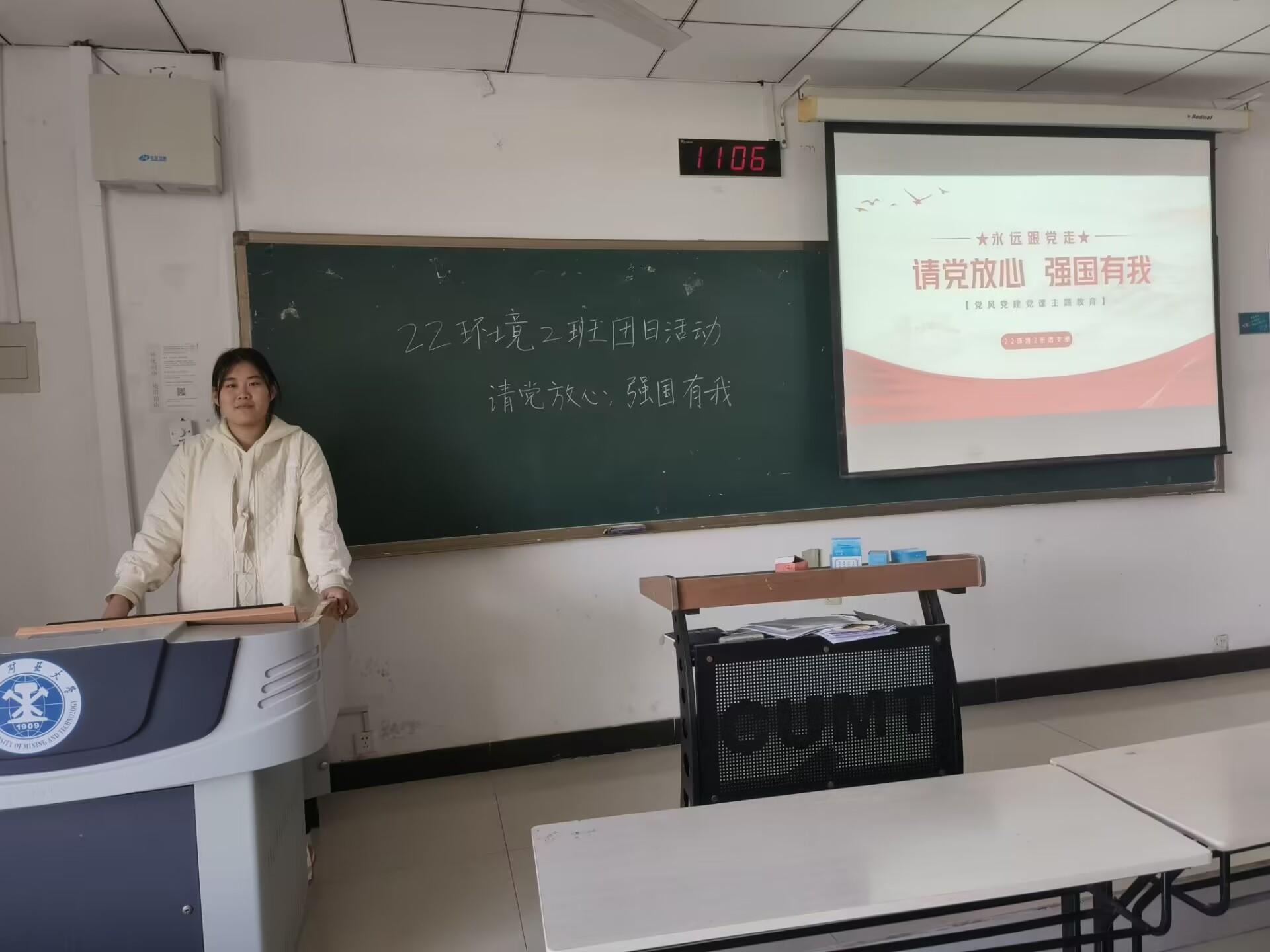 为提升同学们对党和国家的认同感,更加明确自己的使命和担当,10月13日,我院环境类2022-2团支部在博四C401开展“请党放心,强国有我”主题团日活动。本次团日活动由团支书李浩源主持。