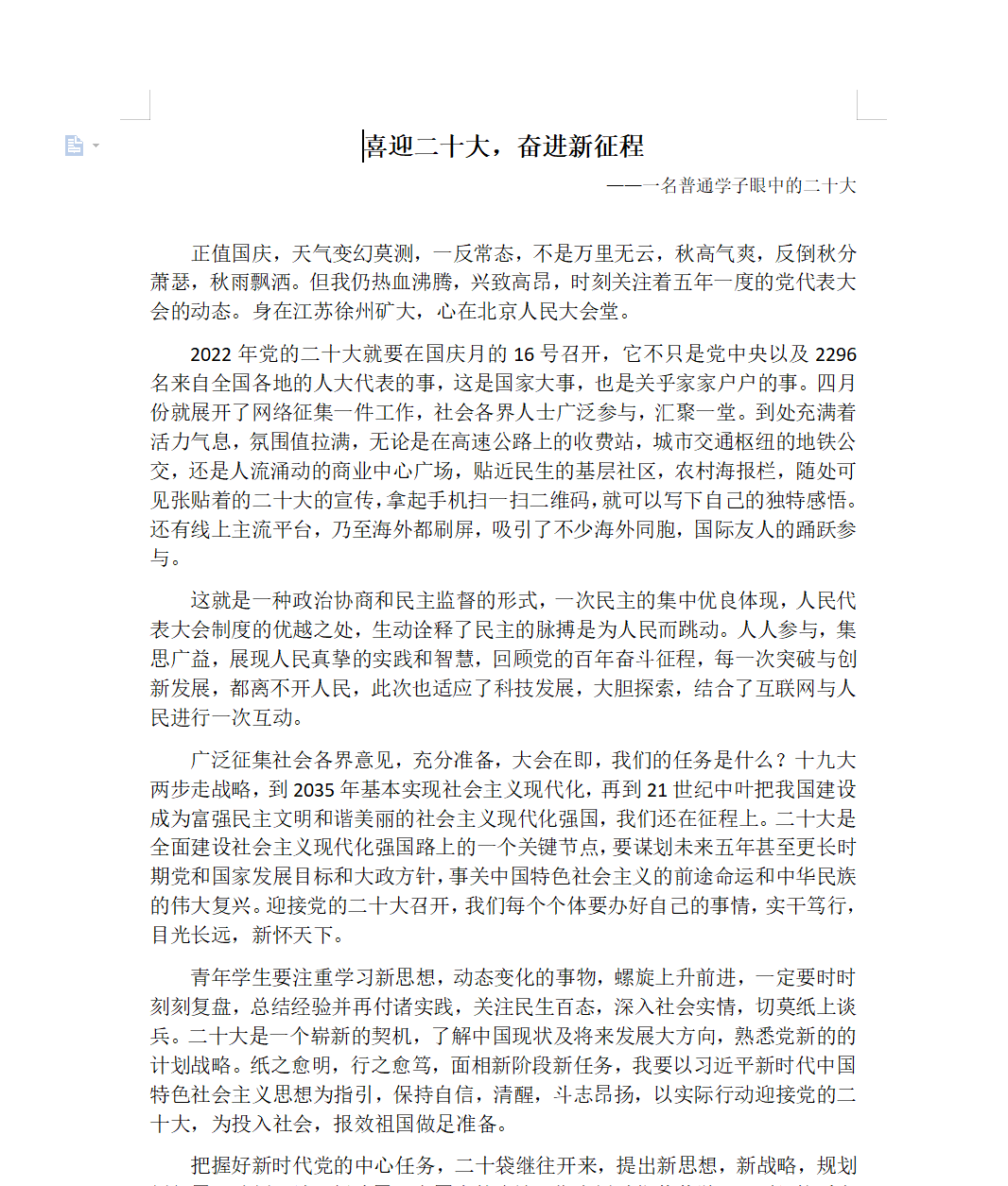 为迎接党的二十大胜利召开,近日,我院学生会办公室举办“喜迎二十大,奋进新征程”主题征文大赛。