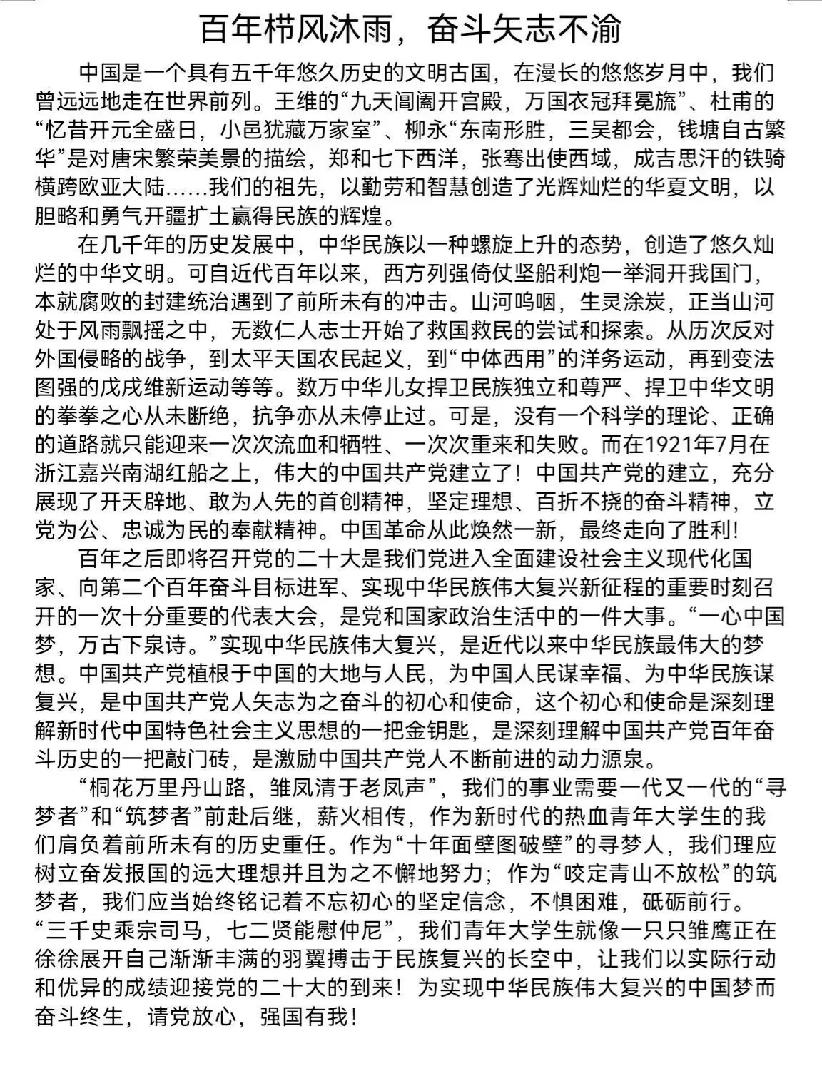 本次活动以写征文的方式来表达同学们在党的二十大结束后对党的二十大思想的领悟以及对于新思想的贯彻和理解。此次活动成功让大家抒发了对国家光明前景展望,收获到不断努力前行的力量,向新征程奋进,用自己的青春担当起国家的责任。