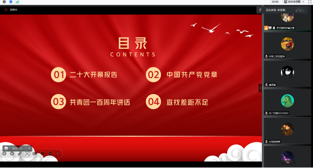 为深入贯彻落实党的二十大精神,了解党的二十大精神内涵以及报告中所聚集的七大问题。12月16日下午四点,我院环境科学与工程类22-2团支部于腾讯会议举办以“学习二十大、永远跟党走、奋进新征程”主题团日活动。