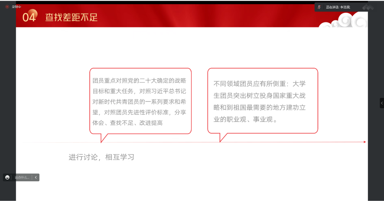 活动伊始,在主持人李浩源简单介绍了活动流程后,进行了学习习近平总书记在党的二十大开幕会的报告。随后开始本次团日活动的第二个内容:了解并学习中国共产党党章的内容,加强了同学们作为青年学子的责任感和使命感。之后,主持人为我们讲解了习近平总书记在庆祝中国共产主义青年团成立一百周年大会上的讲话内容,使同学们明白了“学习二十大、永远跟党走、奋进新征程”的重要意义。在活动的末尾,主持人带领同学们进行最后一项活动“查找差距不足,展望理想奋斗”,期间,班长徐豪勇首先讲述了他自己的不足之处并做出表示该如何改进,同时他也简单的介绍了自己对未来理想的展望;许多同学也积极发言。最后,在主持人李浩源进行本次活动总结后本次活动正式结束。