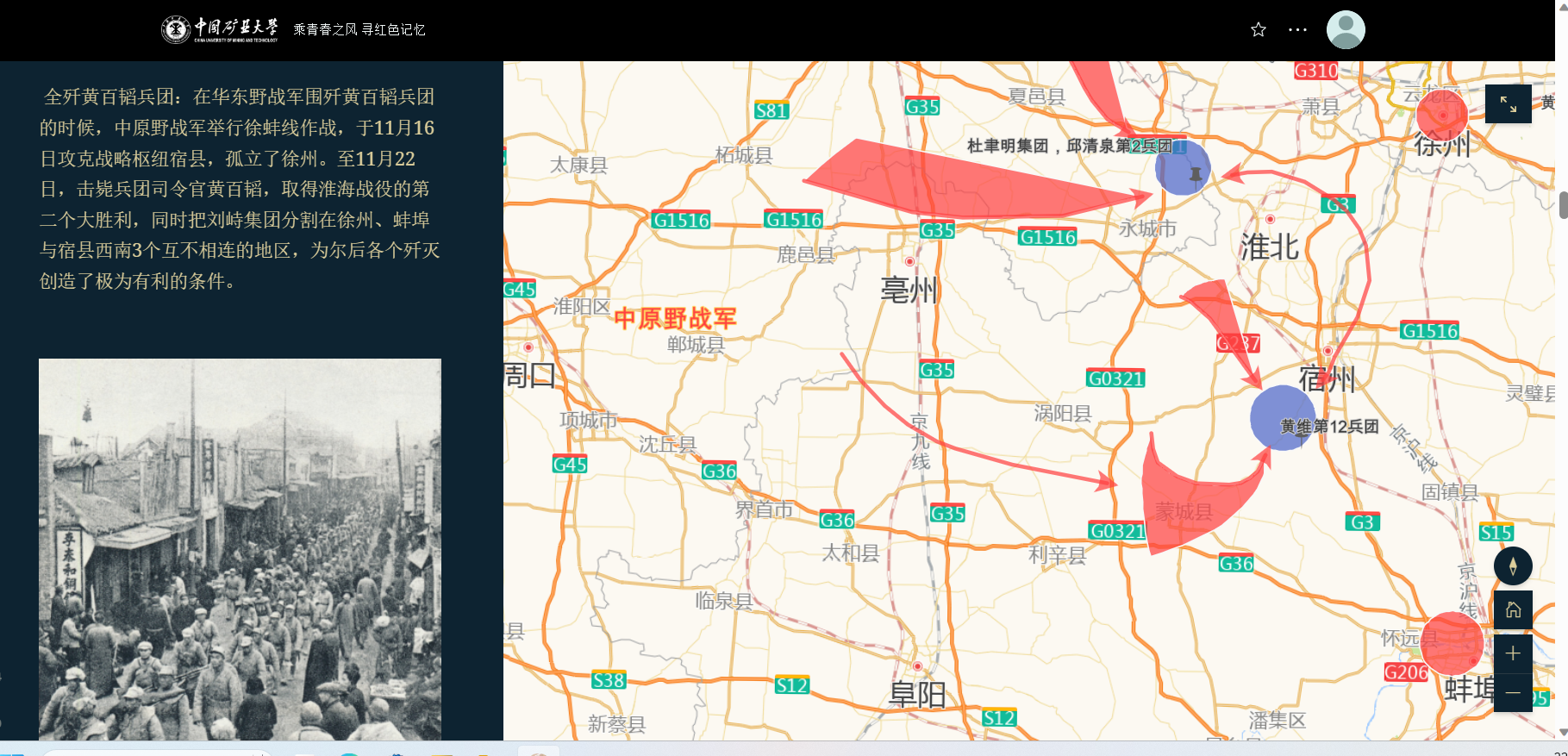 在实践期间,陈樟杰、易乐、那浩宇三位同学与团队成员分享地图制图经验,为地图制作奠定了扎实的理论基础。实践团结合前期线下参观淮海战役纪念馆获取的资料及线上网络资源,并深度学习淮海战役史实,将历史故事与地图制作技巧结合,通过Online Geoscene平台完成了交互式地图的制作。交互式红旅地图作为后续地图宣讲活动的重要媒介,以地图故事网站为展示平台,实践团也将通过这份红旅地图向观众传达这段历史的重大意义与淮海战役背后的伟大精神。