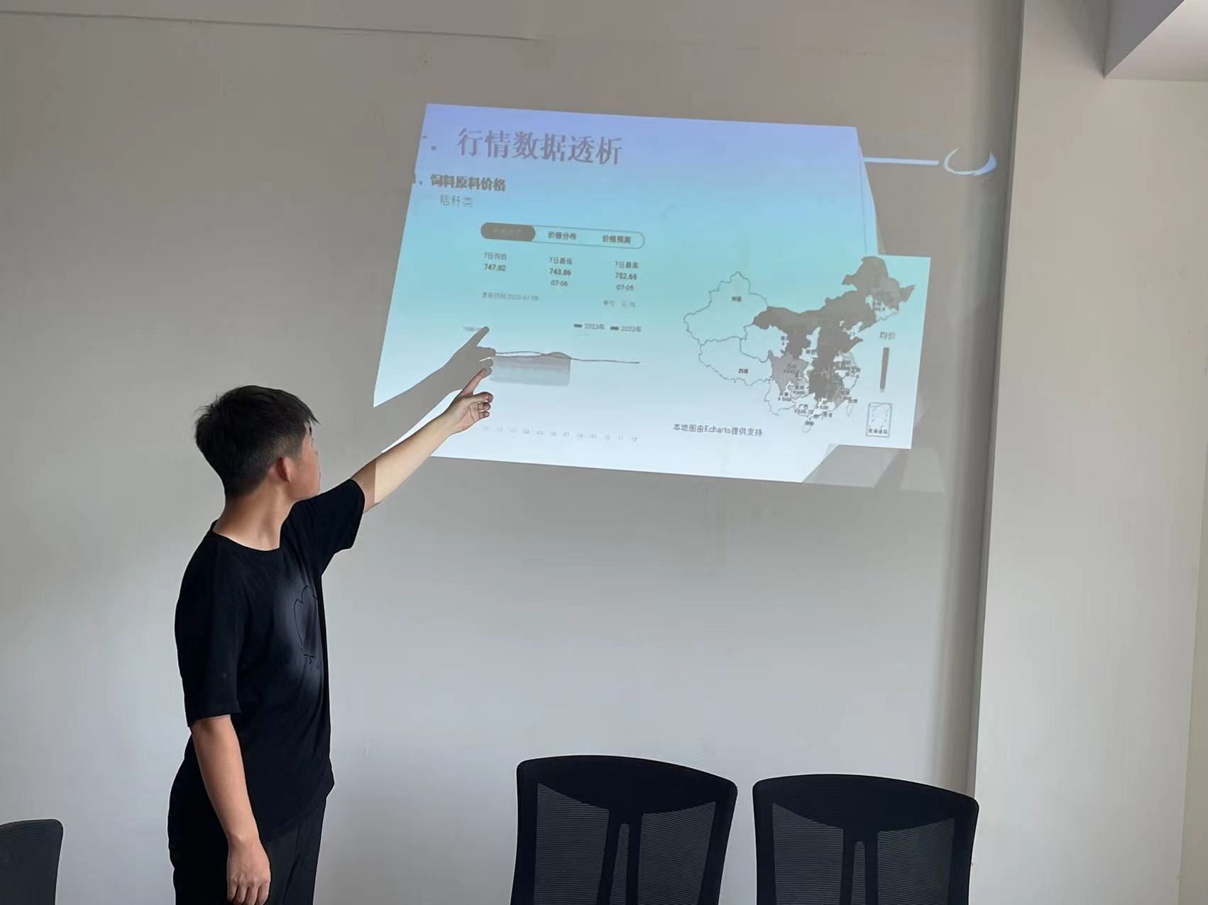 刘宇明同学到达天夏农牧科技有限公司之后,首先简单参观了公司环境,然后在工作人员的引领下来到办公室。在这里刘宇明同学承担了临时助理的职务,协助相关的工作人员、查阅相关资料、制作农户对饲料定制PPT并做讲解,以帮助农户们认识饲料的定制对牲畜育肥的重要性及必要性。刘宇明同学认真的态度也饱受相关人员的夸奖,同时刘宇明同学也发现了农产品相关工作并非容易,切身体会到工作人员的辛苦与努力。