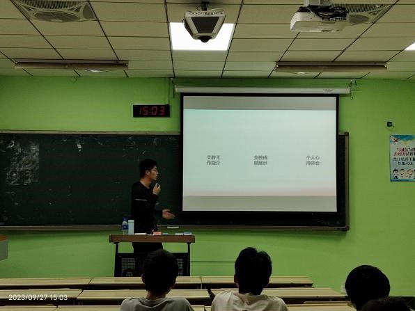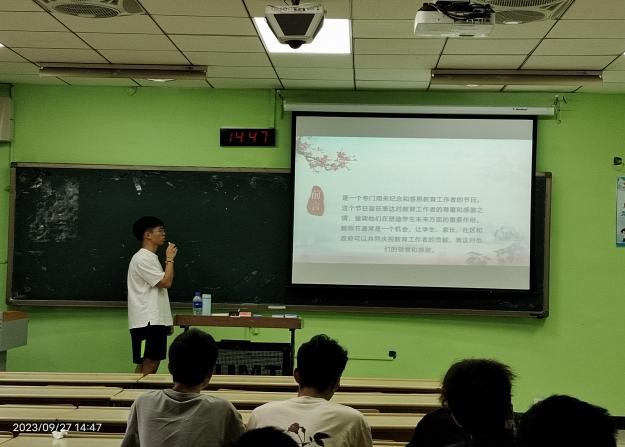 首先班长李博宇给大家介绍了教师节的由来,通过播放影视剧片段让大家更深刻的了解教师节;接着给大家介绍了张桂梅老师、叶嘉莹老师等名教名师典范,一幕幕感人的画面让大家红了眼眶,也让大家知道了教师节的意义;最后李涛同学给大家分享了他在暑期社会实践活动中支教的经历,展示了他的支教成果,激励同学们积极投身教育强国建设实践。