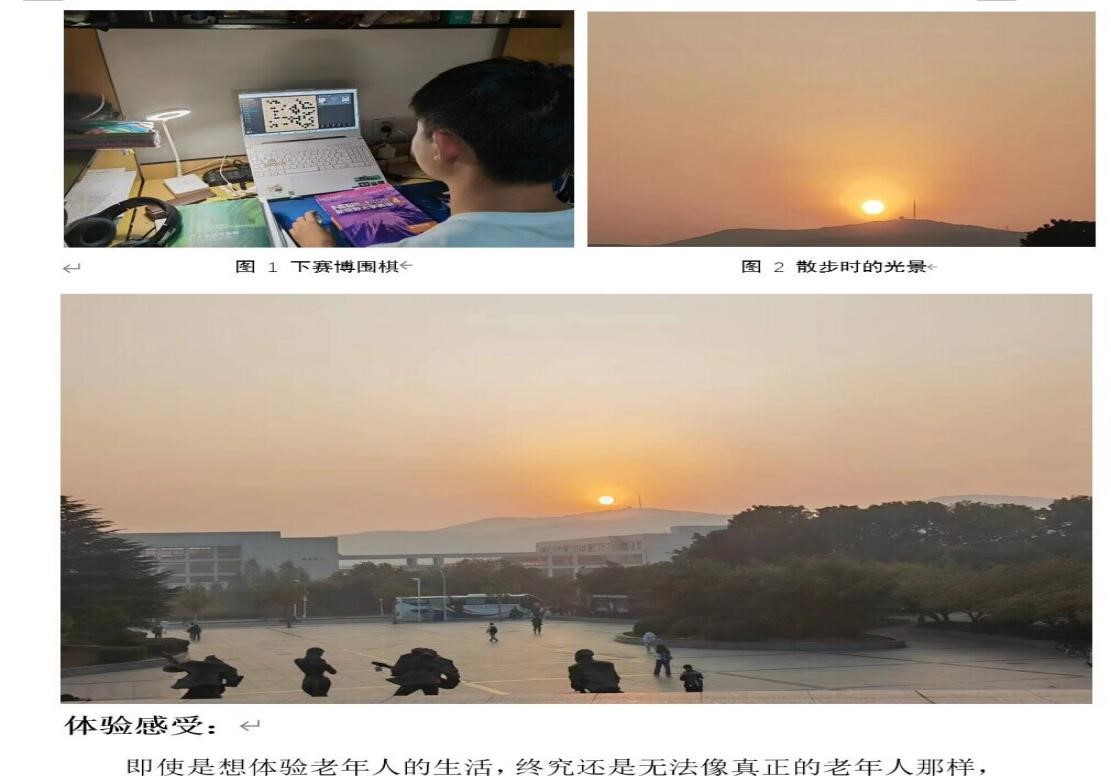本次活动时间从10月23日持续到10月26日。参加活动的同学需自行设计以“六十岁的一天”为题的日程表,并写出每个时间段的活动,配以一段文字说明。其次,要在其中选择1-2项具有老年人特色的活动进行体验并附至少一张图片展示,还需写出在体验活动时感受到的生活的不便及可行的解决方案。最后,评委对同学们作品进行统计和评奖。
