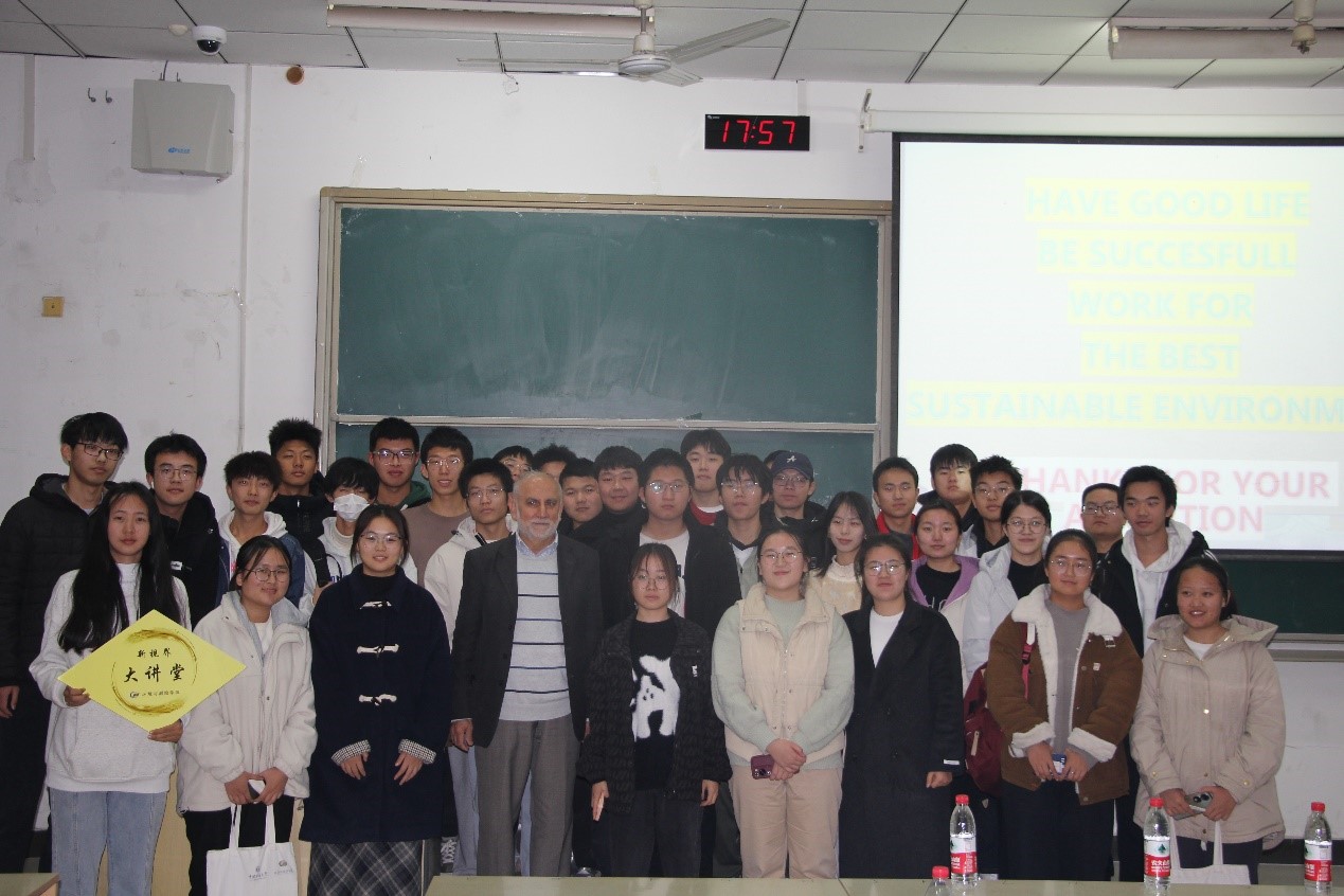 首先,周来院长向同学们介绍了本次活动的目的和内容,随后邀请Ganjidoust教授上台,同学们用热烈的掌声表达了对本次活动的期待与对Ganjidoust教授的欢迎。Ganjidoust教授从引入、环境与生活、环境污染、造成污染的主要原因、污染的溯头、污染带来的损害、未来的解决方式和总结八个方面向同学们展示环境所面临的问题,从而在潜移默化中培养同学们对环境专业重要性的认同,进而激发学生对该专业的学习热情。通过教授形象生动的讲解,学生们发现环境与每个人都息息相关,对于环境的研究与保护刻不容缓。接着,罗萍教授补充介绍了Ganjidoust教授的学术成果,让同学们对这位可爱的教授更加充满敬意。同学们也积极发言,争相向教授提出自己的疑问,与教授探讨。活动的最后,同学们与Ganjidoust教授合影留念。