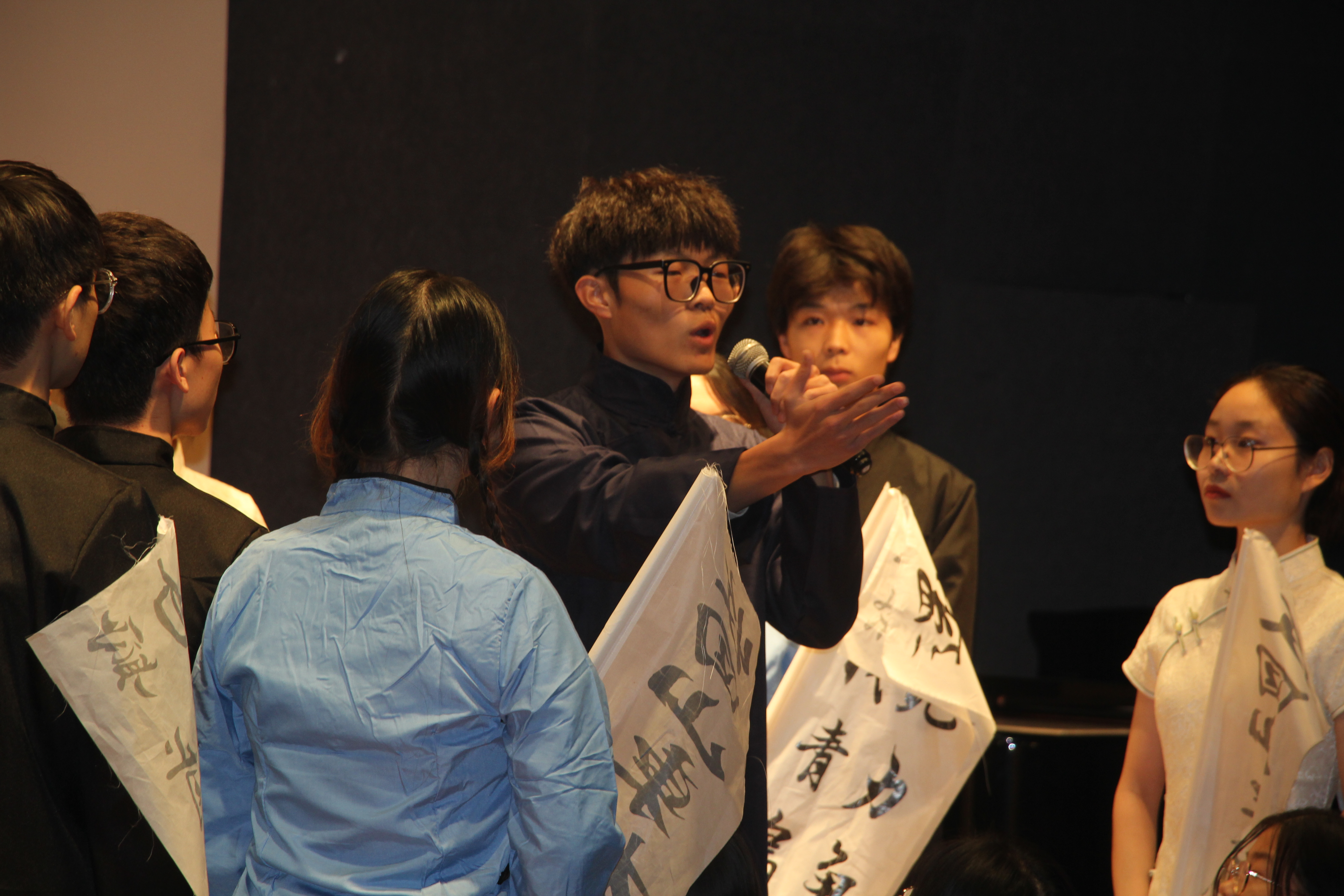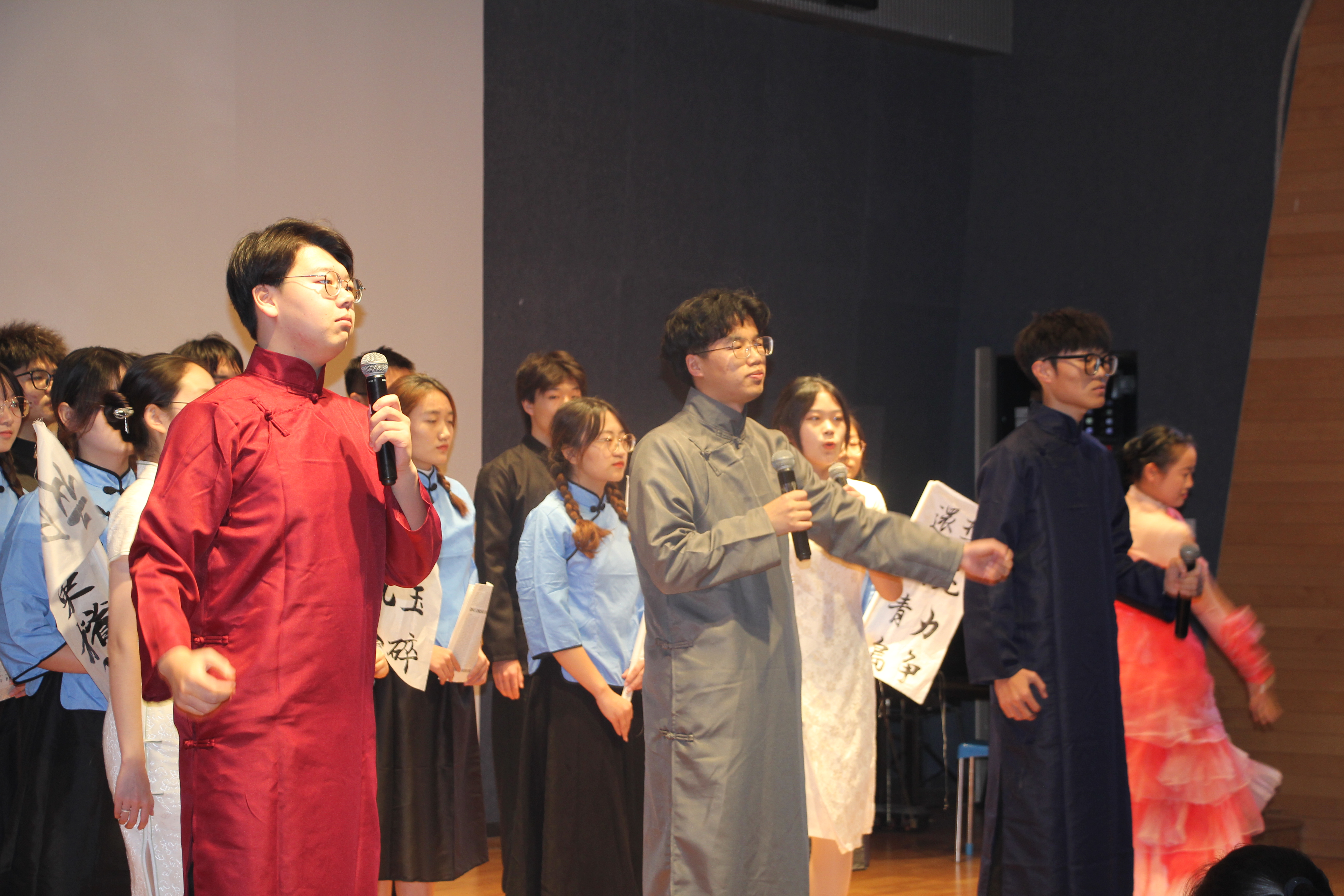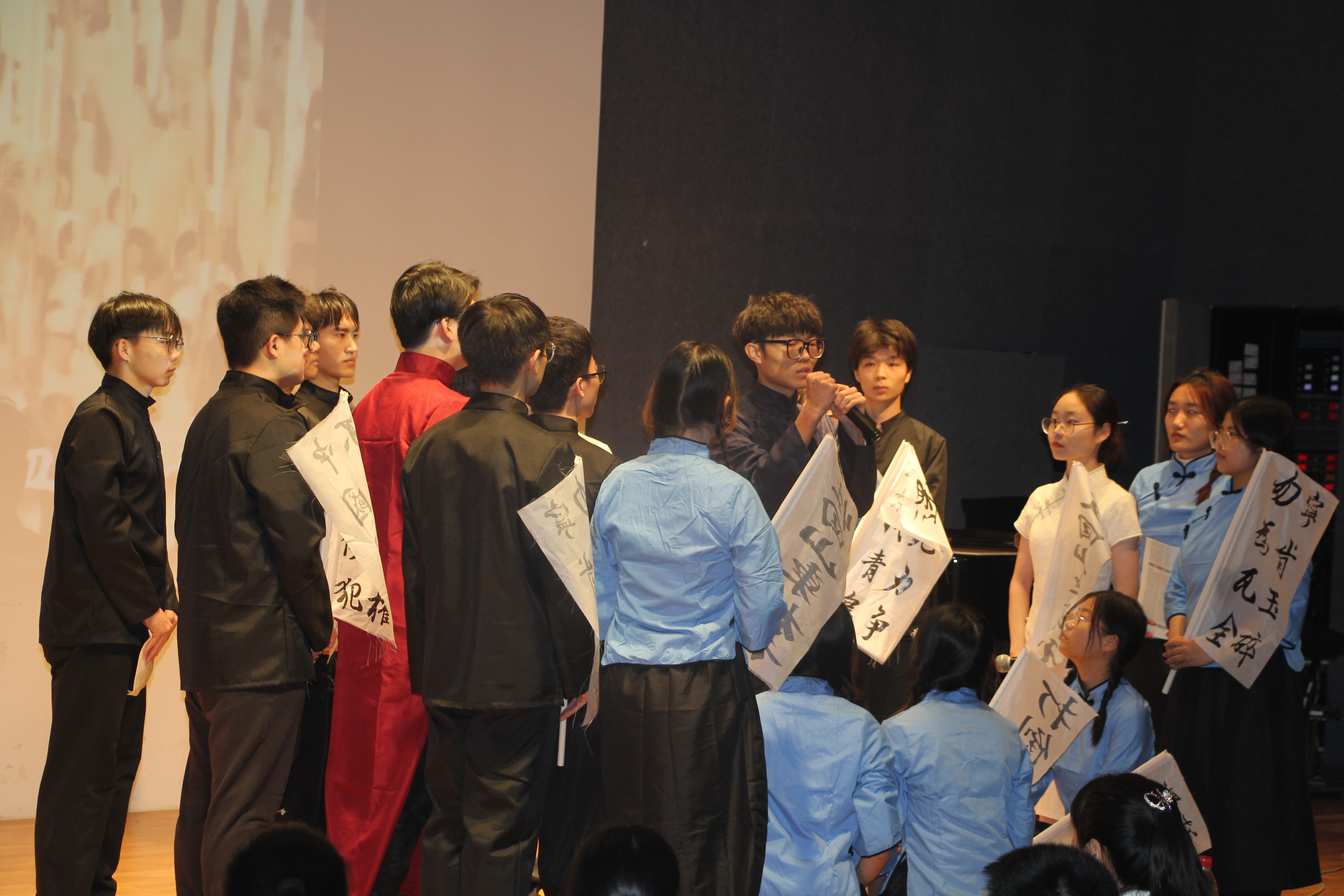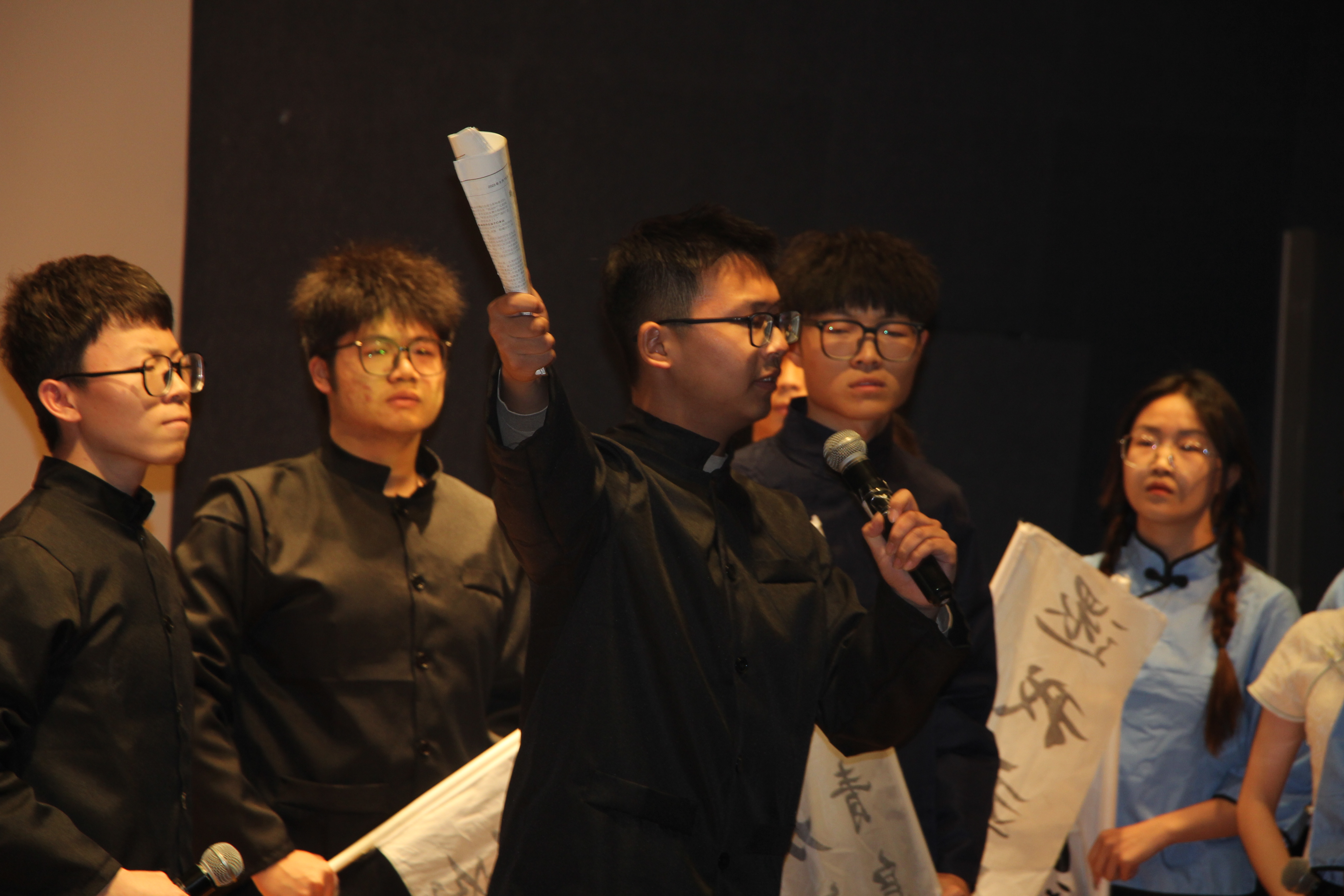 本次活动由人文与艺术学院学生团队指导、二十一个学院参演共同完成。我院代表队带来的节目是《青春》。节目开始,同学们穿越时代,以影子舞的形式拉开序幕。在社会残破、民不聊生的时代,以陈独秀为代表的新青年们创办新报刊、宣传新思想,爱国运动就此展开。“誓死力争,还我青岛”点燃爱国热情,革命年代,爱国学生一腔热血、豪情满怀。最后,同学们发出了振聋发聩的时代呼唤:愿以吾辈之青春捍卫盛世之中华!节目感染了在场的所有观众,赢得了阵阵掌声,获得了评委的一致认可。