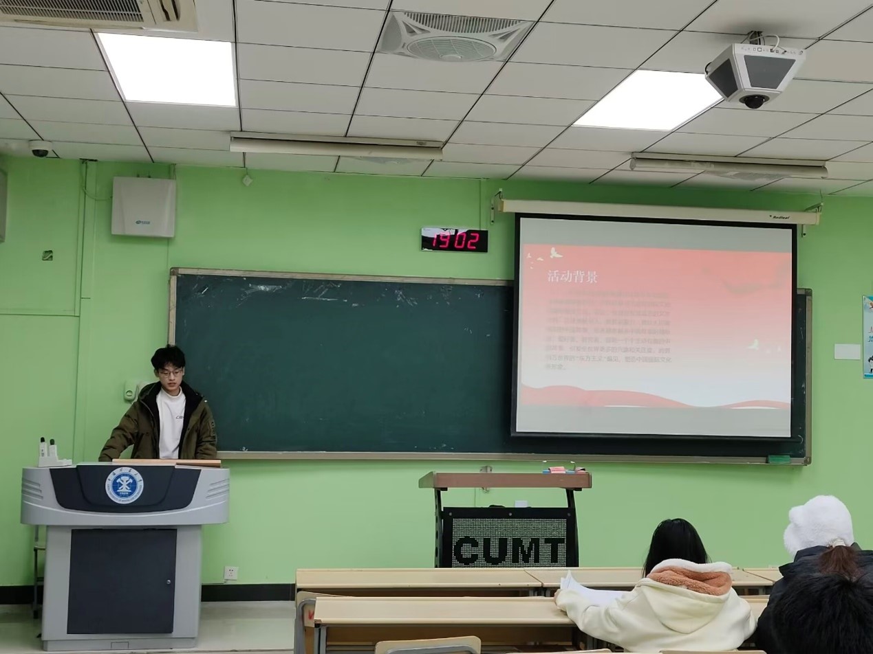 12月29日晚上七点环境工程三班全体成员到达指定团课地点博四c207。团课开始之前,同学们就位等待聆听。主持人开展了团课宣讲,首先讲的是活动背景。他向同学们说明了中国文化的国际传播已经成为文化软实力建设的重要内容,引发同学们对如何讲好中国故事的思考。然后引出第二部分“何为中国故事”。主持人先从中国故事的定义讲起,随即阐述中国故事的发展历程,最后阐明讲好中国故事的必要性和其面临的挑战。最后是第三部分“讲好中国故事”,从全面深入理解讲故事的内涵,处理好文与道的关系,积极拓展形式多样的平台和渠道三个方面向同学们讲述了如何才能讲好中国故事。团课最后,主持人用一个宣传片做了小结,呼吁同学们要将中国故事永存心中,通过自己的努力讲好中国故事。
