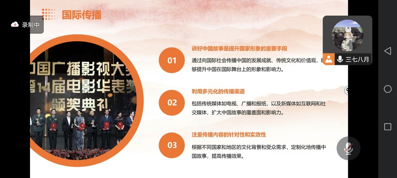 活动伊始,团支书通过PPT简要介绍了本次活动的流程,接着用三个视频资料向大家讲述具有代表性的中国故事。接下来,胥瀚文讲述了山河四省关于介绍自省文化的“内卷行为”,间接体现中国故事的内容丰富和中国文化的博大精深。最后,他介绍了为什么要讲好中国故事以及如何讲好中国故事。